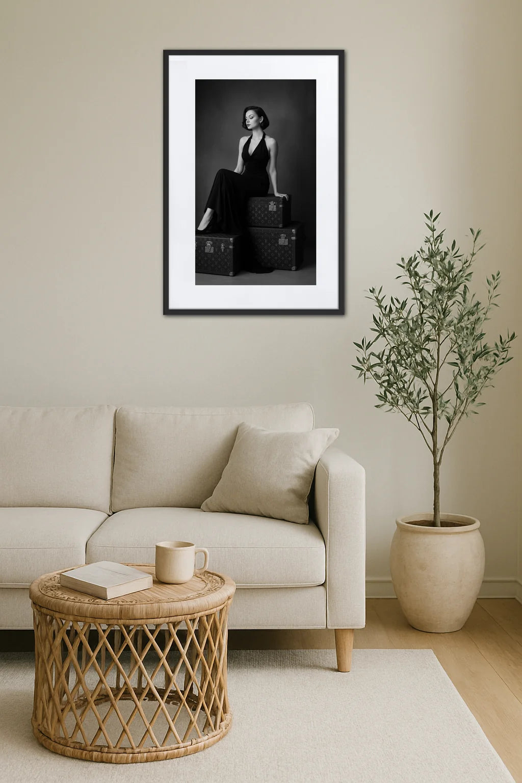 Cette œuvre en noir et blanc révèle plus qu’une simple image, elle dévoile une atmosphère où le raffinement se mêle à une subtile intensité. La pose de la femme, vêtue d’une robe fluide et sombre, évoque un équilibre parfait entre puissance tranquille et douceur intérieure. Placée sur ces malles emblématiques, elle semble incarner un voyage immobile, une quête intime où chaque détail raconte une histoire, celle d’une élégance assumée et d’une confiance silencieuse. La palette réduite à l’essentiel accentue les contrastes de lumière et d’ombre, créant une vibration visuelle qui capte l’attention sans jamais la brusquer. C’est une invitation à contempler la beauté dépouillée, où la forme et la posture s’imposent comme un poème visuel. Ce tableau fait écho à une époque où le style et la personnalité s’exprimaient par des lignes sobres, mais puissantes, une époque où chaque geste racontait un monde intérieur riche et complexe. Il incarne la rencontre entre l’art photographique et la symbolique d’un luxe discret, qui ne se montre pas, mais se ressent profondément.