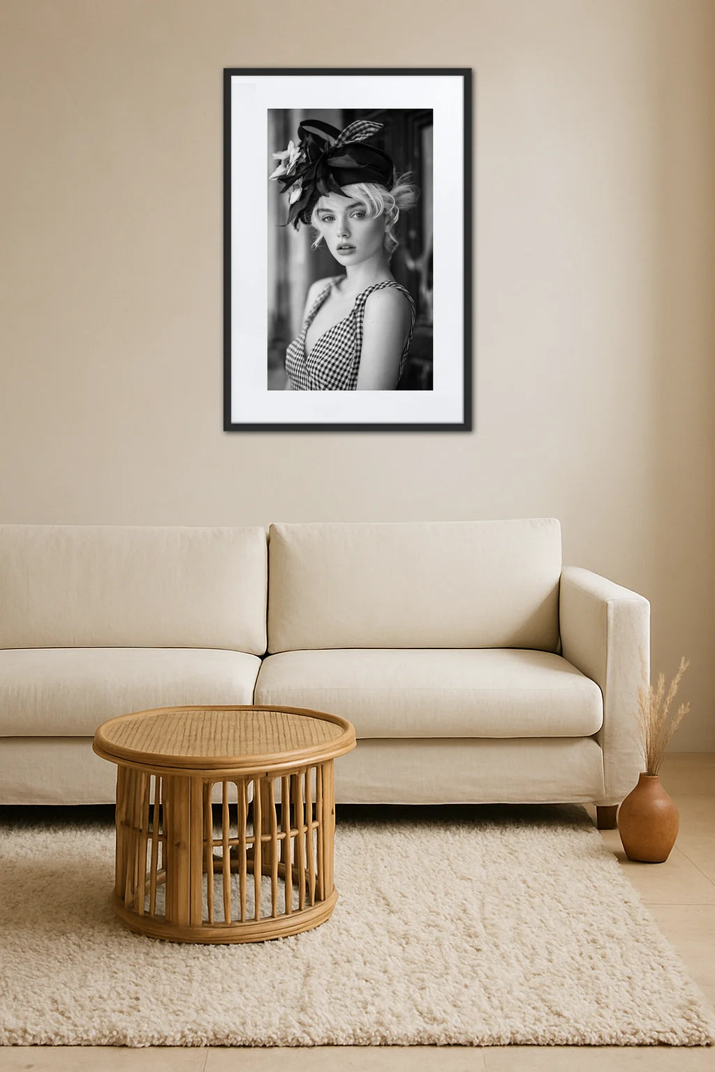 Cette œuvre incarne un instant suspendu entre passé et présent, où se mêlent la sophistication d’une époque révolue et la fraîcheur d’un regard moderne. La composition, tout en nuances de lumière et d’ombre, révèle une femme dont l’attitude parle autant que son apparence. Son chapeau orné de fleurs et de rubans détourne les codes classiques pour offrir une interprétation nouvelle de la mode, empreinte de poésie et de caractère. Chaque pli de sa robe à carreaux, chaque reflet sur son visage semble capturer à la fois la fragilité et la force, l’intimité et la distance. Ce tableau invite à une contemplation profonde, où l’œil découvre au fil du temps des détails inattendus, des émotions enfouies. Il évoque la culture d’un art photographique raffiné, le charme des icônes d’autrefois revisitées avec une modernité subtile. En intégrant cette œuvre dans un espace, c’est un souffle d’âme et d’expression qui se diffuse, un dialogue silencieux entre le spectateur et cette figure énigmatique. C’est l’alliance parfaite entre un style affirmé et une poésie visuelle qui transcende les époques.