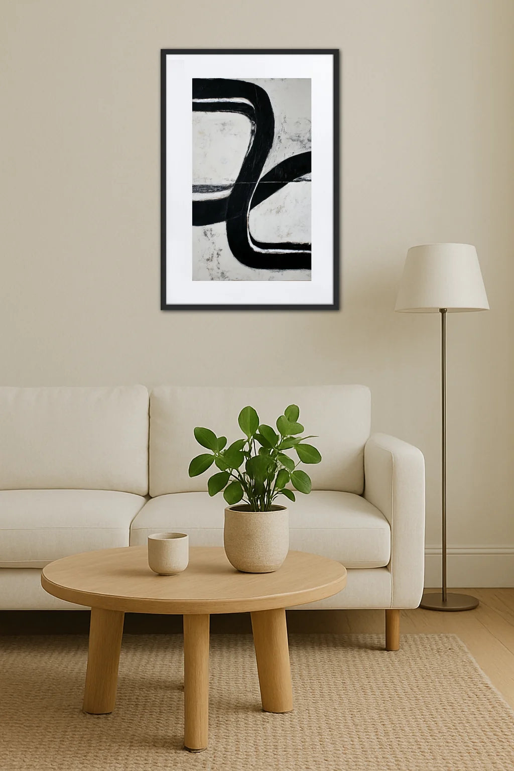 - Équilibre visuel et émotionnel : Les formes sinueuses noires sur fond clair attirent naturellement l’œil, créant un point focal apaisant dans la pièce. Cette harmonie visuelle invite à la réflexion et à la sérénité, apportant une sensation d’apaisement subtil et profond.