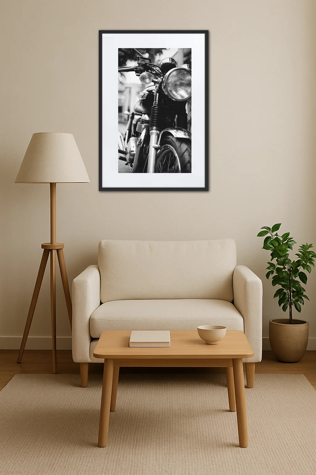 Ce tableau incarne bien plus qu’une simple image, il est le reflet d’une passion intemporelle pour la mécanique et la route. La moto, dans ce jeu d’ombre et de lumière, devient un symbole de liberté et de rébellion élégante, une invitation à l’aventure dans un monde où chaque virage raconte une nouvelle histoire. La scène capturée en noir et blanc sublime les textures et les formes, offrant une profondeur qui stimule l’imaginaire. On ressent presque le rugissement du moteur, la sensation du vent sur la peau, et cette audace qui pousse à s’éloigner du quotidien. L’absence de couleur amplifie la force de l’image, concentrant l’attention sur l’essentiel, révélant la beauté brute et l’âme mécanique de la moto. C’est un hommage à ceux qui voient dans la route une échappée belle, un voyage intérieur, un moment suspendu où le temps semble s’effacer. Ce tableau s’inscrit dans une tradition artistique qui valorise la simplicité et la puissance, mêlant culture urbaine et esthétisme contemporain, pour inviter à une contemplation aussi intense que délicate.
