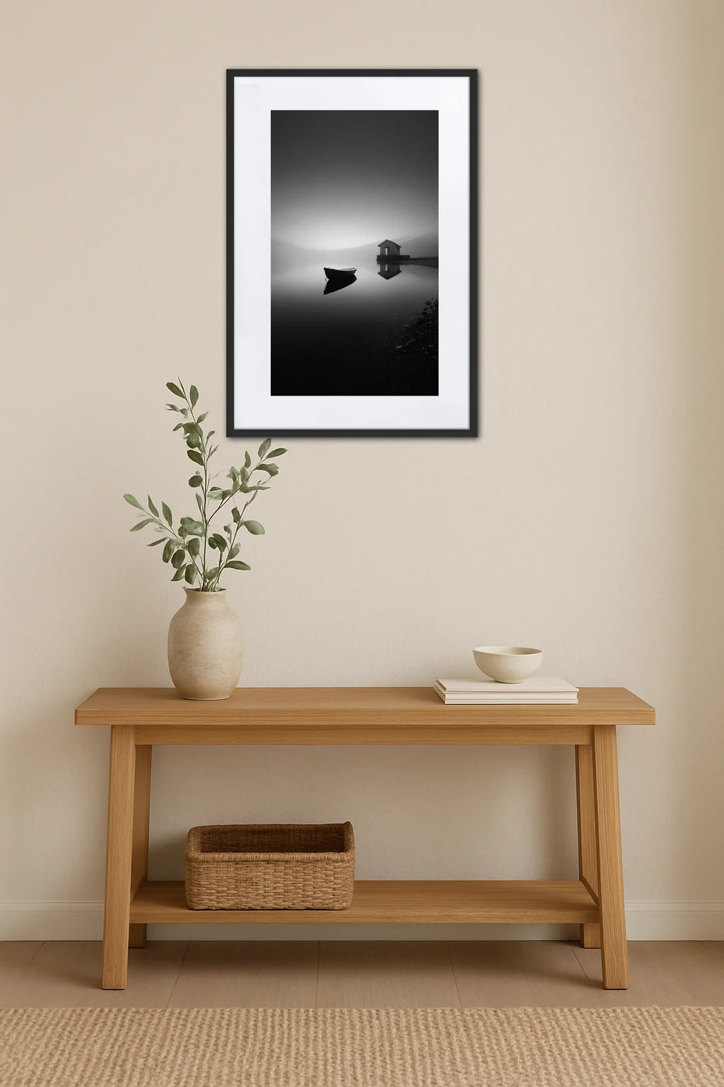 Cette œuvre, à la fois épurée et puissante, nous plonge au cœur d’un instant figé où le temps semble s’étirer à l’infini. La barque solitaire, flottant doucement sur une eau immobile, évoque une quête intérieure, un voyage vers soi-même dans la contemplation du monde naturel. Le jeu des reflets amplifie ce double regard entre l’apparence et la profondeur, entre l’éphémère et l’éternel. L’ombre dense et la lumière diffuse dialoguent pour créer une atmosphère empreinte de mystère et d’apaisement. Ce paysage en noir et blanc n’est pas simplement une représentation, mais une expérience visuelle et émotionnelle où chaque détail est chargé de sens. Il rappelle les grands maîtres de la photographie et de la peinture monochrome qui savaient capter l’âme des lieux par la maîtrise des contrastes. Plus qu’une image, ce tableau est une invitation à ralentir, à écouter le murmure des éléments et à se laisser porter par une poésie visuelle intemporelle. C’est un hommage à la beauté simple, celle qui se révèle quand on accepte de plonger dans la profondeur du regard et de l’émotion.
