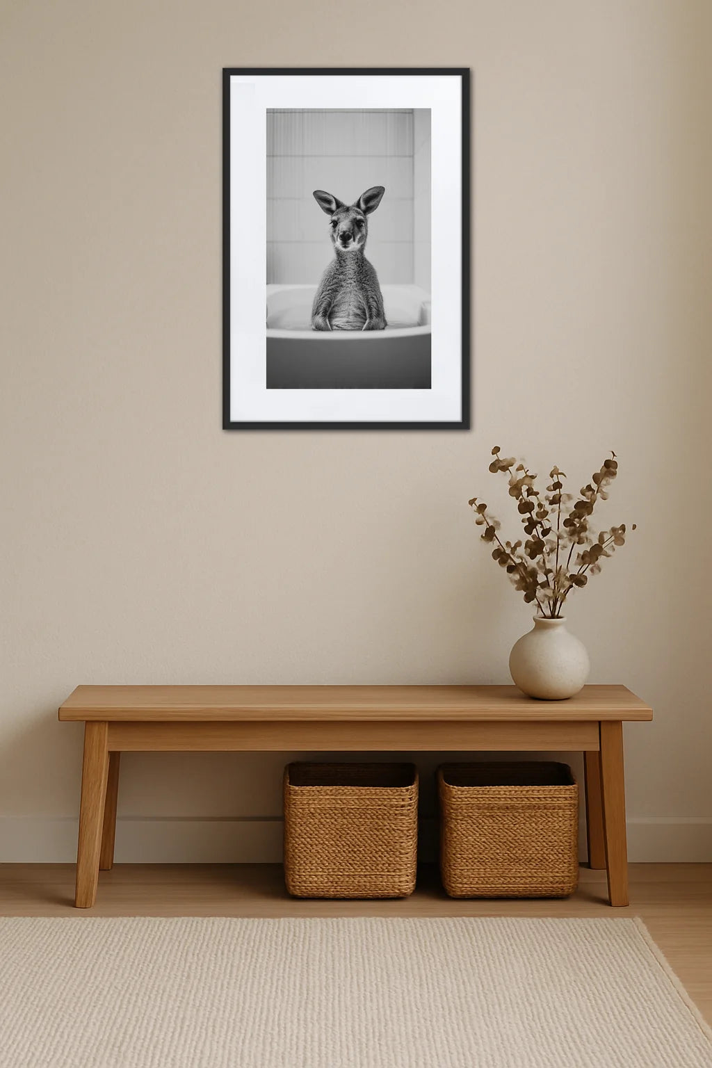 Cette œuvre singulière s’inscrit dans une tradition contemporaine où le quotidien se pare d’une touche d’extravagance et de poésie. L’image d’un kangourou, figure inattendue et pleine de charme, prend place dans un espace domestique, créant un pont entre le sauvage et l’intime. Le choix du noir et blanc accentue la pureté des formes et met en exergue chaque détail avec une délicatesse presque photographique. L’absence de couleur invite à une immersion dans un univers où le regard se concentre sur la texture, la lumière et les nuances. Au-delà de sa simple présence décorative, ce tableau évoque une pause, un moment suspendu où l’imaginaire se mêle à la réalité. Il capte à la fois la curiosité enfantine et la sérénité d’un instant volé, offrant une expérience visuelle riche et apaisante. C’est une invitation à redécouvrir les espaces familiers sous un angle nouveau, où chaque regard devient une conversation silencieuse entre l’œuvre et son spectateur. Cette pièce devient ainsi une ode à la douceur, à l’émerveillement et à la rencontre inattendue entre deux mondes.