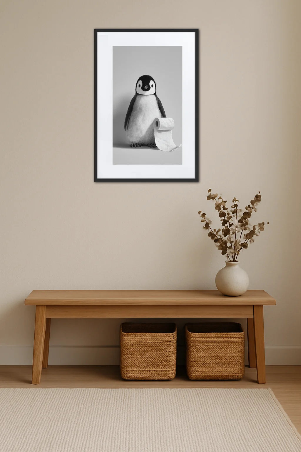 Ce tableau noir et blanc pour WC déploie une atmosphère à la fois tendre et amusante, invitant à redécouvrir un quotidien souvent délaissé avec un regard neuf, presque enfantin. L’image d’un petit pingouin, tendre et curieux, qui se tient aux côtés d’un rouleau de papier, joue avec les contrastes visuels et les symboles détournés. Il s’agit d’un clin d’œil à la fois discret et malicieux, qui réchauffe l’espace intime et souvent fonctionnel des toilettes. Par son choix monochrome, l’œuvre renforce la pureté des formes et la douceur du message, tout en évoquant une esthétique raffinée propre à l’art contemporain. Ce pingouin au regard franc devient le compagnon silencieux d’instants suspendus, où l’humour se mêle à une certaine poésie. Plus qu’un simple décor, ce tableau devient un témoin de légèreté et de délicatesse, un pont entre l’ordinaire et l’extraordinaire, une invitation à savourer les petits moments avec un sourire complice et une élégance discrète.