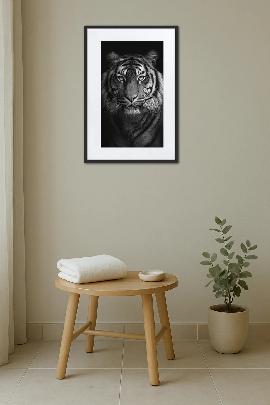 - Esthétique épurée : L’absence de couleurs superflues met en valeur chaque détail du pelage et des traits du tigre, offrant une pureté visuelle qui apaise l’esprit. Cette simplicité raffinée invite à la contemplation et à un voyage intérieur profond.