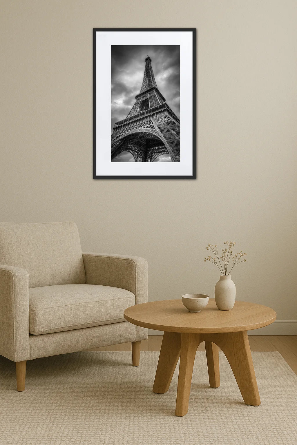 Cette œuvre saisit l’essence même de la Tour Eiffel, icône universelle qui incarne à la fois l’audace technique et le raffinement artistique. En choisissant de figer ce monument dans des nuances de noir et blanc, l’artiste offre une vision épurée où le contraste intensifie la présence de chaque structure métallique, presque vivante sous un ciel chargé d’émotions. L’image suggère une rencontre entre la force brute de l’acier et la délicatesse des formes, évoquant la dualité entre modernité et tradition, entre rêve et réalité. Cette représentation transcende la simple photographie pour devenir un hommage à l’âme parisienne, à ce dialogue entre passé et présent, où chaque ombre et lumière raconte une histoire. L’impression grand format invite à se perdre dans les détails, à ressentir la grandeur et la fragilité mêlées de ce symbole. C’est une immersion qui suscite la réflexion, une ode à la beauté saisissante d’un monument qui, dans son immobilité apparente, pulse au rythme vibrant de la ville lumière.