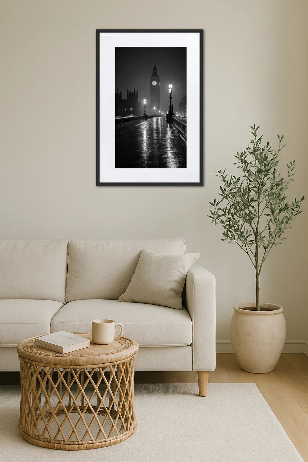 Ce tableau invite à plonger dans une atmosphère à la fois familière et énigmatique, où la ville se révèle dans toute sa splendeur nocturne. Le pont déserté, baigné par la lueur diffuse des lampadaires, conduit le regard vers une horloge emblématique qui semble suspendue dans un temps immuable. Cette œuvre évoque non seulement l’architecture majestueuse mais aussi la poésie des instants volés, lorsque la ville se fait silencieuse et que ses contours se dessinent avec une précision presque surnaturelle. Ici, la simplicité du noir et blanc transcende le réel pour offrir une vision épurée, presque onirique, où chaque détail prend une dimension nouvelle. Les jeux entre ombres et lumières soulignent la beauté des contrastes, tandis que la scène capture l’essence même de l’urbanité : un mélange de rigueur et de mystère, de calme et de mouvement latent. En contemplant ce tableau, on ressent cette énergie subtile qui anime les grandes métropoles, cette dualité entre l’immobilité apparente et la vie qui palpite juste en dessous. C’est une invitation à s’arrêter, à observer, à rêver, et à ressentir la puissance d’un lieu chargé d’histoires et d’émotions intemporelles.