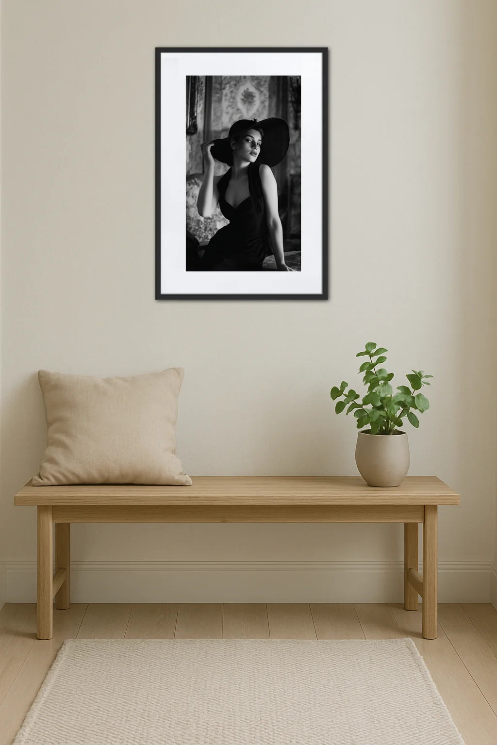 Cette œuvre incarne une rencontre entre le passé et le présent, où chaque détail raconte une histoire de raffinement et de mystère. La silhouette féminine, vêtue d'une robe sombre et coiffée d'un large chapeau, évoque une époque révolue, empreinte d’un charme nostalgique et d’une sophistication rare. Les jeux d’ombre et de lumière soulignent la profondeur du décor, où les motifs anciens se mêlent à une ambiance feutrée, presque secrète. Le regard posé, à la fois rêveur et assuré, semble inviter à une réflexion intime, un dialogue silencieux entre l’œuvre et son observateur. Par sa composition et son esthétique, ce tableau s’inscrit dans une tradition artistique qui célèbre la beauté du noir et blanc, révélant la richesse des contrastes et la force expressive de la forme pure. Plus qu’un simple portrait, il devient un hommage à la féminité, à la mémoire des temps passés, et à l’intemporalité de l’art qui transcende les modes pour toucher l’âme.