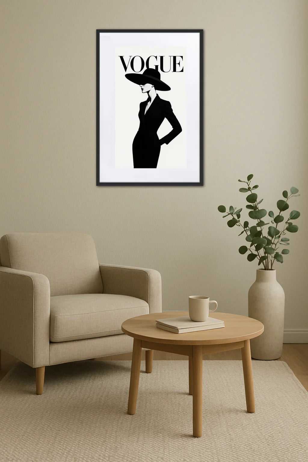 Cette œuvre incarne une ode à la sophistication monochrome, où chaque ligne dessine une posture résolue et pleine de charme. La femme représentée, vêtue d’un manteau sombre et coiffée d’un large chapeau, semble figée dans une pose à la fois fière et énigmatique, rappelant les icônes de la mode d’antan tout en s’inscrivant dans une esthétique contemporaine. Le choix du noir et blanc accentue la pureté du message, où le sobre devient un langage puissant, capable de transmettre force et délicatesse. Le cadre épuré souligne la stature de ce personnage qui semble défier le temps, oscillant entre une allure classique et une modernité affirmée. Plus qu’un simple portrait, ce tableau évoque un dialogue entre passé et présent, un hommage aux magazines emblématiques qui ont marqué l’histoire visuelle et culturelle. Il invite à ressentir cette tension entre ombre et lumière, entre la force et la douceur, traduisant ainsi une élégance intemporelle qui ne se démode jamais. Chaque regard posé sur l’œuvre est une plongée dans un univers où l’art et la mode fusionnent pour raconter une histoire pleine de style et de caractère.