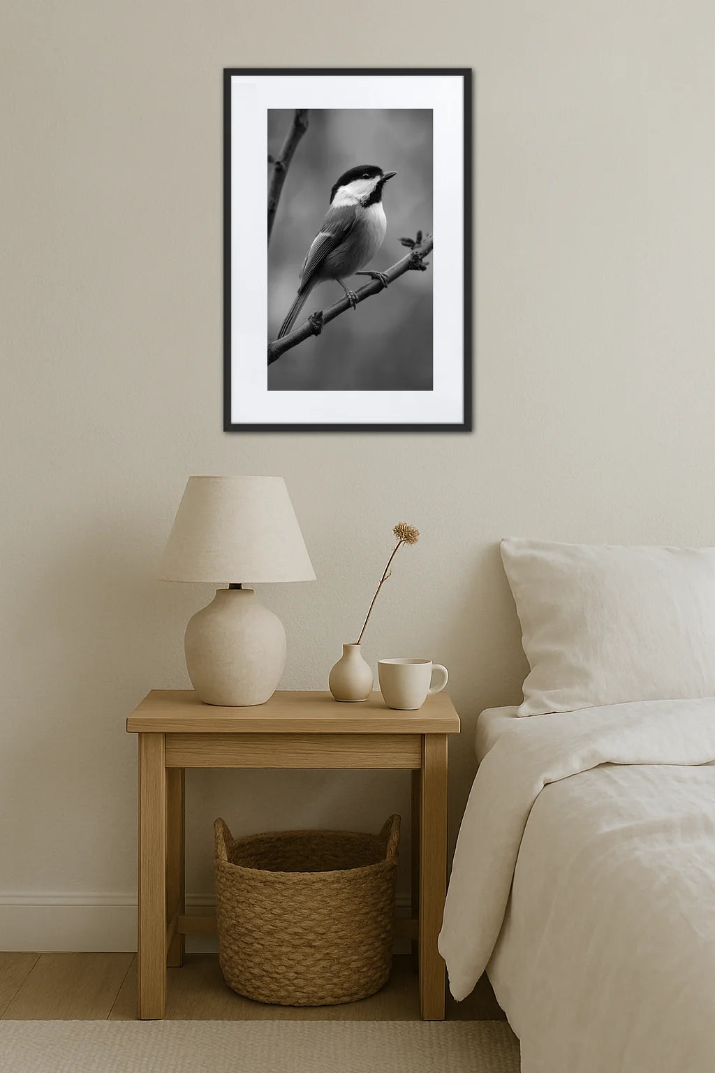 Ce tableau, par son interprétation épurée en noir et blanc, transcende la simple représentation d’un oiseau perché. Il évoque un dialogue silencieux entre la fragilité de ce petit être et la puissance des formes qu’il occupe. La dualité des teintes souligne le jeu subtil entre présence et absence, entre le visible et l’implicite. Chaque plume semble vibrer d’une énergie retenue, comme suspendue dans un souffle d’air immobile, où le temps semble ralentir. Sur cette branche, l’oiseau devient le symbole d’une poésie visuelle, un instant de grâce figé qui invite à la réflexion sur la beauté simple et la profondeur des choses. L’œuvre puise aussi dans la tradition artistique du clair-obscur, technique ancestrale qui magnifie les volumes par le contraste des lumières et des ombres, conférant à ce tableau une aura intemporelle et universelle. Plus qu’une image, ce tableau est un hommage à la nature et à son mystère, une invitation à s’arrêter, à observer et à ressentir, bien au-delà du regard. Il parle à ceux qui savent écouter le murmure du monde et percevoir l’élégance dans la sobriété.