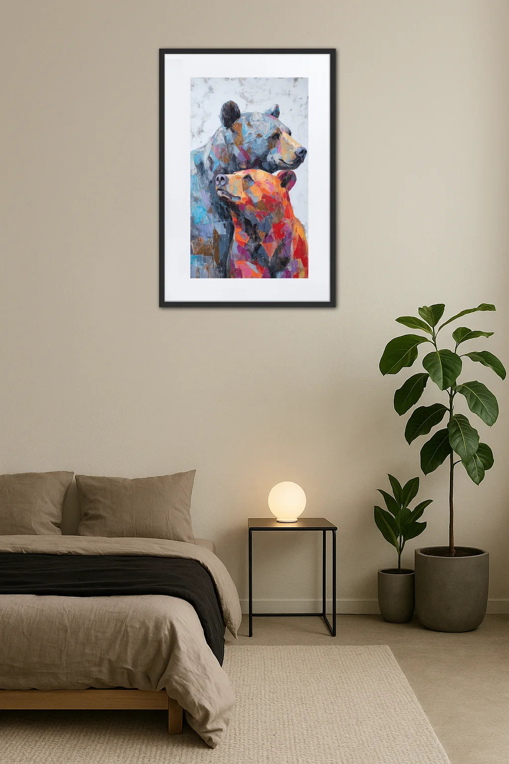 Cette œuvre, au-delà de son image première, raconte une histoire d’équilibre entre la puissance brute et la tendresse contenue. L’ours, symbole ancestral de force et de sagesse, est ici réinterprété dans un style moderne où chaque fragment de couleur semble raconter une émotion enfouie. Le peintre joue habilement avec les formes et les éclats pour créer un dialogue entre les deux figures, l’une protectrice, l’autre confiante. Cette composition évoque non seulement la nature sauvage, mais aussi la complexité de nos sentiments, comme un miroir de nos relations humaines. L’association des teintes chaudes et froides traduit un contraste harmonieux, une sorte de danse entre l’énergie et la sérénité. En s’éloignant du réalisme, l’artiste invite à une lecture plus intime, presque spirituelle, où le spectateur devient acteur de son propre ressenti. Ce tableau est une ode à la dualité, à la vie qui oscille entre force et douceur, s’épanouissant dans un jeu subtil de lumières et d’ombres. Il capte ainsi l’essence même du vivant, dans une esthétique contemporaine qui transcende le simple décor pour toucher l’âme.
