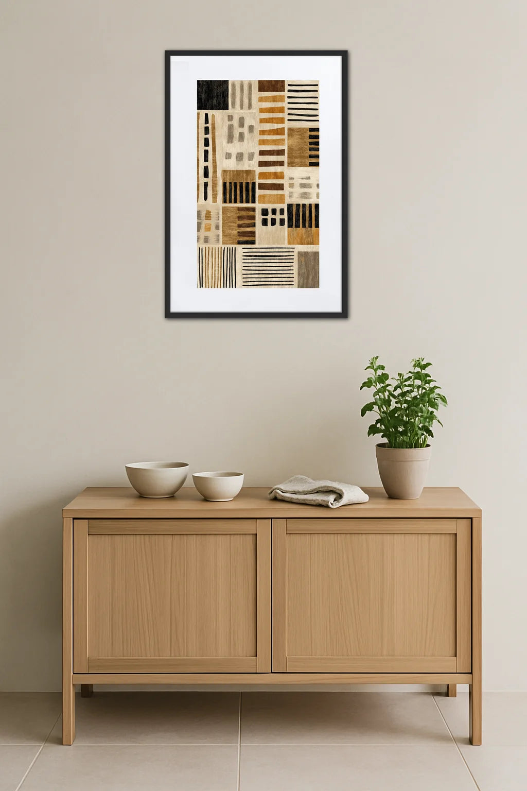 Ce tableau puise son essence dans la richesse des tissus traditionnels africains, où chaque motif géométrique est une porte ouverte vers un univers symbolique. Les formes soigneusement agencées évoquent les pagnes tissés à la main, témoins silencieux de générations qui transmettent savoir-faire et émotions. Au-delà de sa composition visuelle, l’œuvre célèbre la dualité entre modernité et tradition, offrant un dialogue entre passé et présent. Les contrastes des textures rappellent la vie quotidienne africaine, entre rituels et spontanéité, tandis que les nuances terreuses reflètent la connexion profonde à la nature et à la terre mère. En contemplant ce tableau, on ressent un souffle d’authenticité et une invitation à s’immerger dans une culture riche et vivante, portée par la force des symboles et la beauté des gestes ancestraux. Il incarne ainsi un pont entre l’art contemporain et l’héritage culturel, une pièce qui ne se limite pas à sa surface mais qui ouvre une fenêtre sur une histoire profonde et universelle.