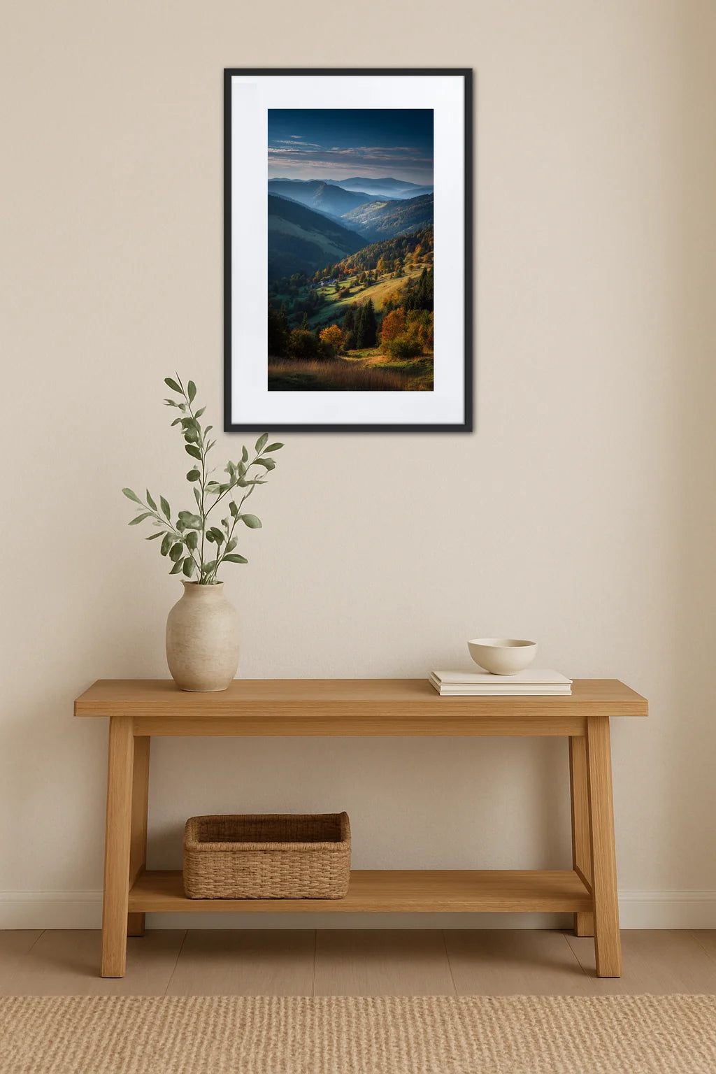 - Jeu de lumière naturelle : La lumière caresse les vallées et fait vibrer les couleurs automnales, créant un contraste subtil entre ombre et clarté. Cette atmosphère lumineuse nourrit un sentiment de chaleur intérieure, un doux refuge face à l’agitation du quotidien.