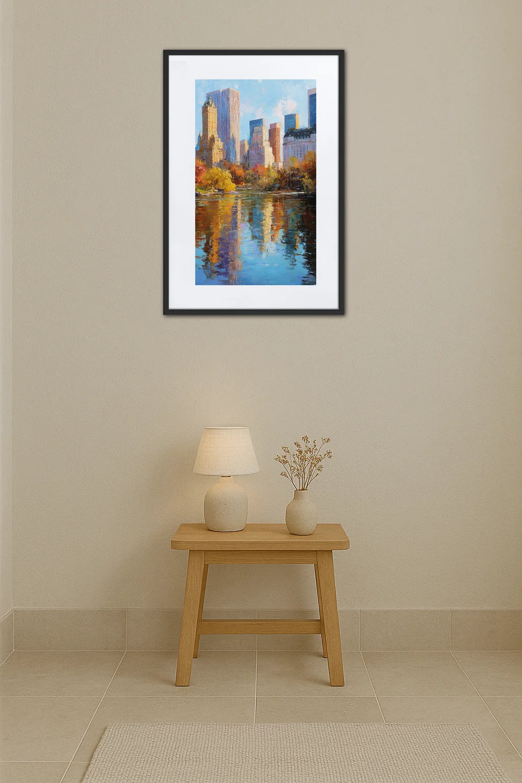 Capturer New York dans un instant où la lumière caresse tendrement les façades des gratte-ciel, telle est la promesse de ce tableau. L’œuvre évoque ce moment précieux où la ville, habituellement frénétique, se pare d’une douceur inattendue. Le reflet des immeubles sur l’eau calme du parc invite à une méditation silencieuse sur la coexistence de la nature et de l’architecture. Cette représentation transcende le simple paysage urbain pour devenir un hymne à la beauté insoupçonnée des instants quotidiens. On perçoit dans la composition une invitation à voir au-delà du tumulte, à apprécier la richesse des contrastes entre la grandeur des constructions humaines et la fragilité des feuillages d’automne. Ce tableau résonne comme un pont entre le rêve et la réalité, où les couleurs chaudes et les formes délicates racontent l’histoire d’une ville en perpétuel mouvement, mais aussi d’une émotion partagée. Il offre une fenêtre ouverte sur un New York poétique, inspiré et profondément vivant, qui touche autant les amateurs d’art que les passionnés d’urbanité.