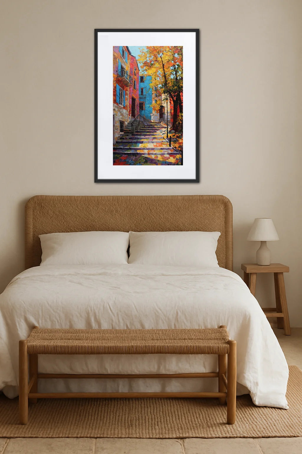 Cette œuvre incarne la poésie d’un instant figé, où la ville révèle ses contrastes et ses harmonies inattendues. Sous un ciel limpide, les façades colorées se dressent avec une intensité presque palpable, jouant avec la lumière pour offrir un spectacle visuel riche et nuancé. L’artiste capte le murmure des pierres anciennes et la douceur des feuilles d’automne, mêlant tradition et modernité dans un ballet de formes et de couleurs. L’escalier, fil conducteur de ce tableau, invite à la montée, à l’élévation, comme une métaphore du voyage intérieur que chacun peut emprunter. Cette ruelle est une scène où le quotidien devient art, où chaque détail raconte une histoire, une mémoire urbaine pleine de vie et de mystère. La composition équilibre la rigueur architecturale avec la spontanéité d’une nature qui s’impose doucement, rappelant que la ville est aussi un lieu d’émotions et d’évasion. Ce tableau offre ainsi une fenêtre ouverte sur un univers où se conjuguent lumière, énergie et sérénité, une invitation permanente à contempler et ressentir la beauté des espaces de vie modernes.