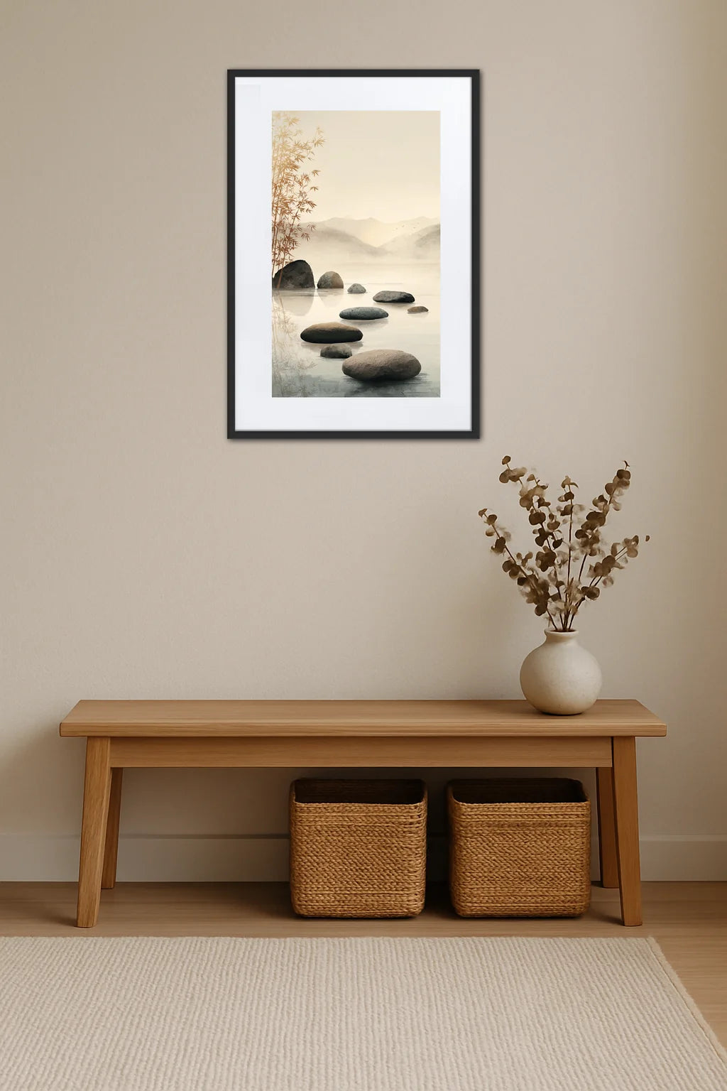 Cette œuvre s’inscrit dans une tradition où le calme et la nature fusionnent pour offrir un refuge à l’âme. Le paysage représente un chemin tracé par des pierres qui flottent doucement à la surface d’un lac paisible, enveloppé d’une brume légère. Ces éléments rappellent les jardins japonais, sanctuaires d’harmonie où chaque détail est pensé pour apaiser le regard et l’esprit. Le contraste entre la présence tangible des pierres et la douceur diffuse du fond crée une tension délicate, comme une invitation à avancer sans précipitation. À travers cette scène, c’est une poésie visuelle qui se déploie, mêlant subtilement le tangible et l’évanescent. Les montagnes lointaines se dessinent avec retenue, laissant place à une rêverie où le spectateur se perd pour mieux se retrouver. Ce tableau ne se contente pas de représenter un paysage, il incarne une expérience intérieure, une pause suspendue dans le tumulte du monde, où la contemplation devient un art de vivre.