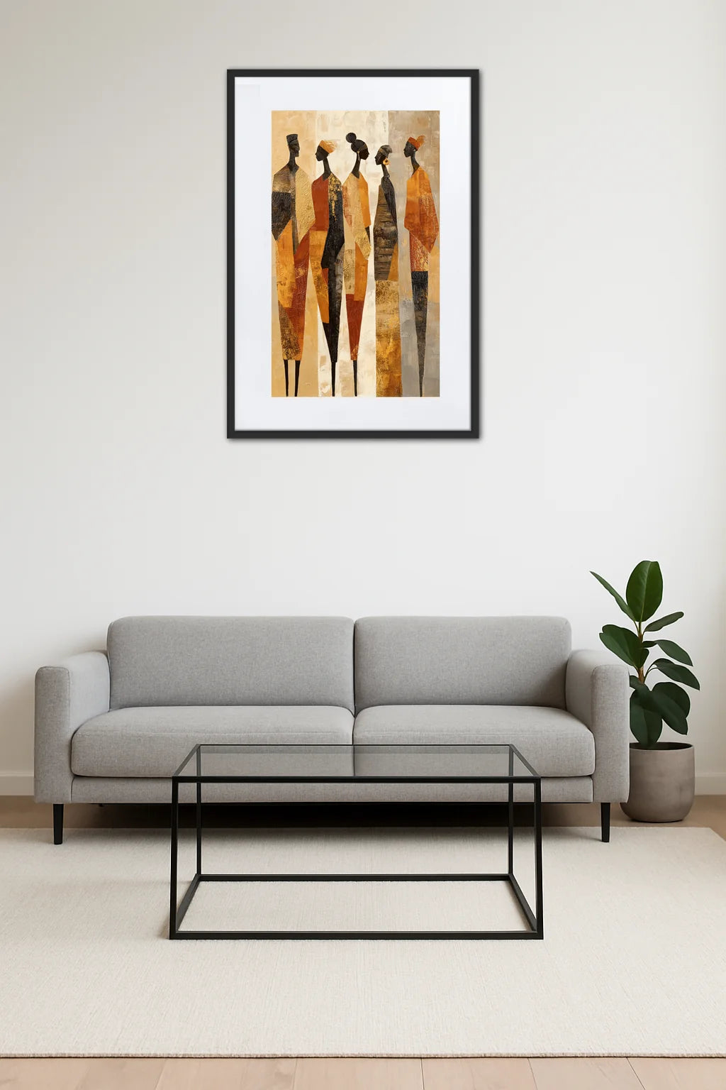 Ce tableau illustre bien plus qu’une simple représentation visuelle, il raconte une rencontre intime avec l’esprit et la force des personnages africains. Les formes allongées et les postures fières traduisent une dignité intemporelle, tandis que les nuances chaleureuses révèlent la richesse de la terre et la chaleur humaine. Chaque personnage semble dialoguer avec son voisin, créant une harmonie silencieuse mais puissante, qui évoque à la fois la communauté et la singularité. Cette œuvre s’inspire des traditions africaines, où le corps est un vecteur d’expression profonde, mêlant le sacré au quotidien. Le mélange subtil des textures et des formes invite à une promenade visuelle où le mouvement est figé, mais l’énergie circule librement. La palette choisie, aux tons naturels et terreux, rappelle le désert, la savane, et les tissus précieux portés au fil des générations. C’est une célébration de la vie, des racines et des histoires transmises, qui transcende le temps et l’espace pour toucher celui qui contemple. Ce tableau devient alors un pont entre le spectateur et la culture africaine, une invitation à ressentir le souffle et la beauté d’un monde vibrant et authentique.