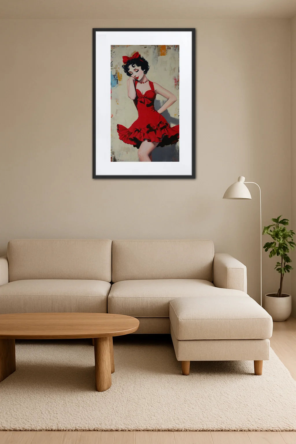 Cette œuvre incarne la rencontre entre une icône de la culture populaire et une interprétation artistique pleine de vie et de caractère. Betty Boop, figure emblématique du dessin animé des années 30, est ici sublimée par une posture à la fois espiègle et rêveuse, incarnant l’esprit libre et la féminité affirmée. Le rouge éclatant de sa robe et du nœud dans ses cheveux capte immédiatement le regard, symbolisant la passion, la force et la séduction douce. Autour d’elle, un fond aux teintes neutres mais texturées crée un contraste qui accentue sa présence magnétique, presque comme un souffle d’air frais dans un monde en mouvement. Cette pièce ne se contente pas de reproduire un personnage, elle raconte une histoire d’émancipation artistique, de nostalgie revisitée à travers un prisme moderne. Le tableau dialogue avec l’observateur, l’invite à ressentir la vitalité d’une époque tout en s’abandonnant à la poésie d’un instant suspendu. Chaque détail, chaque ombre, chaque éclat de couleur participe à une composition où se mêlent élégance et dynamisme, capturant l’essence même du Pop Art dans une célébration visuelle pleine de sens.