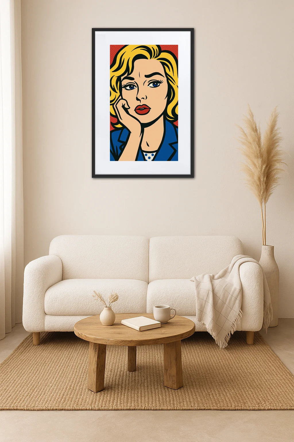 Ce tableau Pop Art Cartoon s’inscrit dans la tradition d’une iconographie détournée où la figure féminine, magnifiée par des traits nets et expressifs, devient le miroir d’une émotion universelle. Ici, la femme représentée incarne une introspection profonde, oscillant entre nostalgie et force intérieure, comme si elle dialoguait silencieusement avec le spectateur. Les contours affirmés et les aplats audacieux s’unissent pour créer une tension visuelle qui capte instantanément l’attention, tout en racontant une histoire chargée de paradoxes. La puissance de ce style, largement inspiré des chefs-d’œuvre de la bande dessinée et de la culture populaire, s’exprime à travers un jeu de contrastes saisissants, où chaque couleur semble vibrer d’une énergie propre. Cette œuvre invite ainsi à une double contemplation : celle du regard sur l’image, et celle du ressenti profond, presque tactile, qui émane de cette iconographie revisitée. En cela, elle transcende le simple portrait pour devenir un témoignage vibrant d’une époque, d’une émotion et d’un art qui refuse la neutralité, préférant l’engagement et la vitalité.