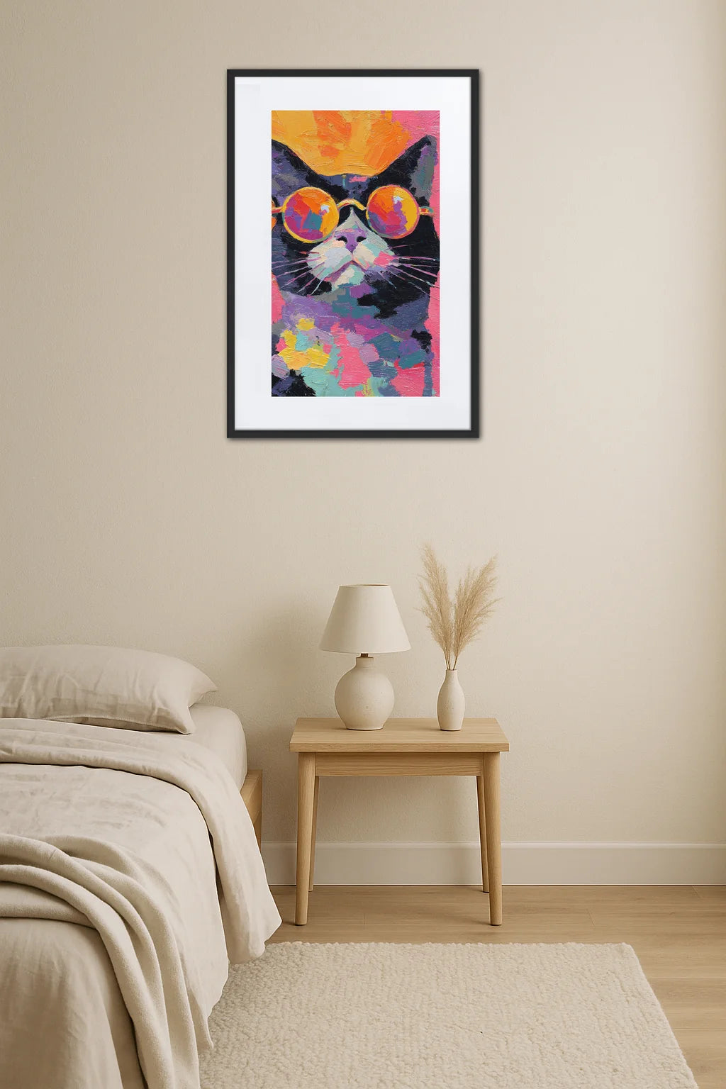 - Un personnage au charme magnétique : Le chat, avec ses lunettes rondes et son expression unique, évoque une personnalité à la fois espiègle et confiante. Cette présence forte invite à une connexion émotionnelle, presque complice, avec l’observateur.