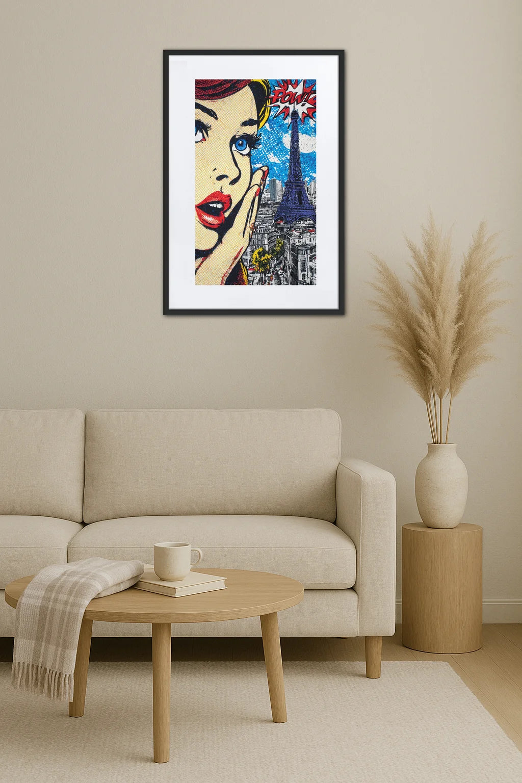 Cette œuvre singulière réinvente la capitale française à travers le regard d’une héroïne pop, dont le visage expressif incarne un mélange subtil d’émerveillement et de surprise. À travers un jeu de contrastes puissants et de motifs emblématiques, le tableau évoque une rencontre entre la culture populaire et l’élégance intemporelle de Paris. La silhouette majestueuse de la Tour Eiffel se dresse au cœur d’un ciel éclaté, rappelant l’énergie bouillonnante d’une métropole qui ne dort jamais. Chaque détail, des traits délibérément stylisés aux éclats de bulles graphiques, raconte une histoire de dynamisme et de modernité, tout en rendant hommage à l’héritage artistique qui a façonné la ville. L’œuvre invite à une promenade visuelle où passé et présent fusionnent, où la mémoire collective s’anime au rythme d’un souffle nouveau. Cette composition vibrante, presque cinématographique, est une célébration de la vie citadine, où chaque regard posé sur le tableau devient une invitation à rêver, à ressentir et à s’immerger dans une atmosphère où l’art devient langage universel.