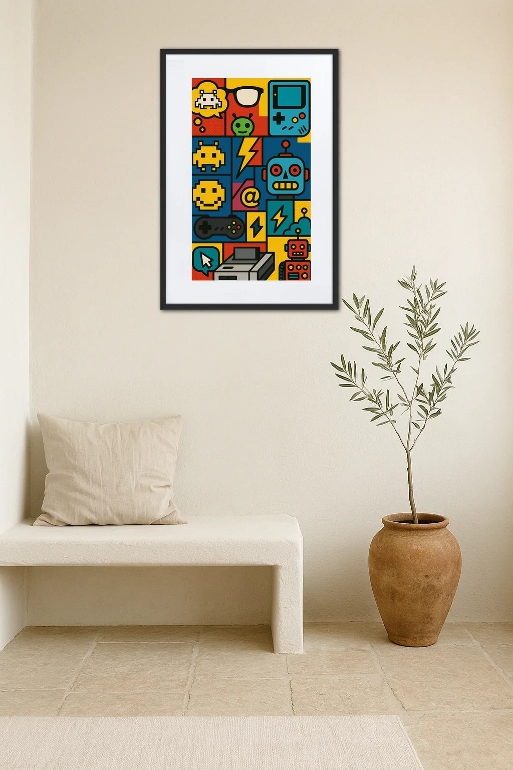 - Impact visuel fort : Les blocs colorés et les icônes pixelisées captivent immédiatement le regard, créant une dynamique qui électrise l’espace. Cette vivacité chromatique éveille un sentiment d’excitation et de joie, comme un clin d’œil complice à un univers familier et ludique.
