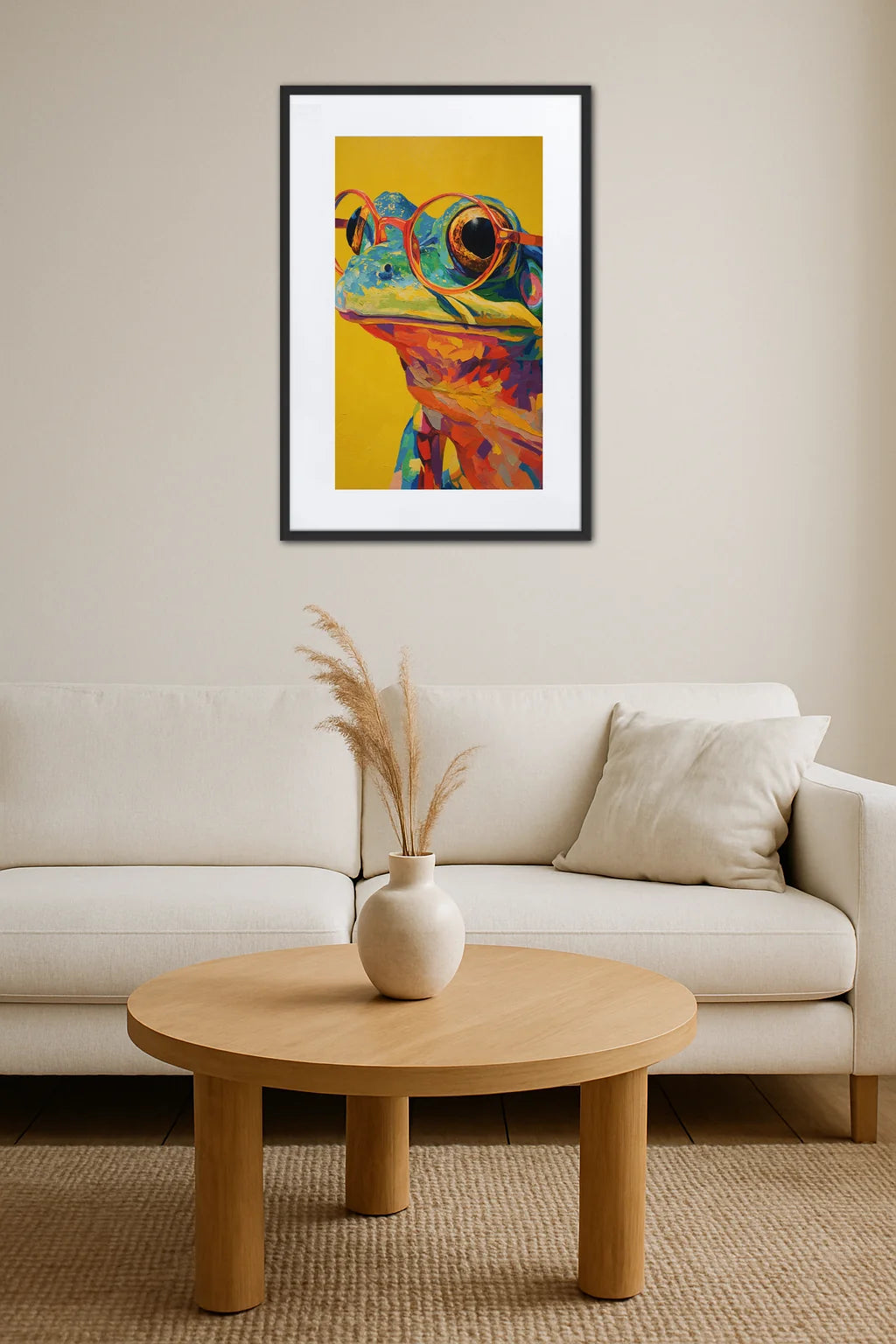 - Une expression pleine de caractère : La grenouille, parée de ses lunettes audacieuses, dégage une personnalité unique qui invite à sourire et à rêver. Cette complicité visuelle génère une émotion joyeuse, un lien subtil entre l’œuvre et son observateur.
