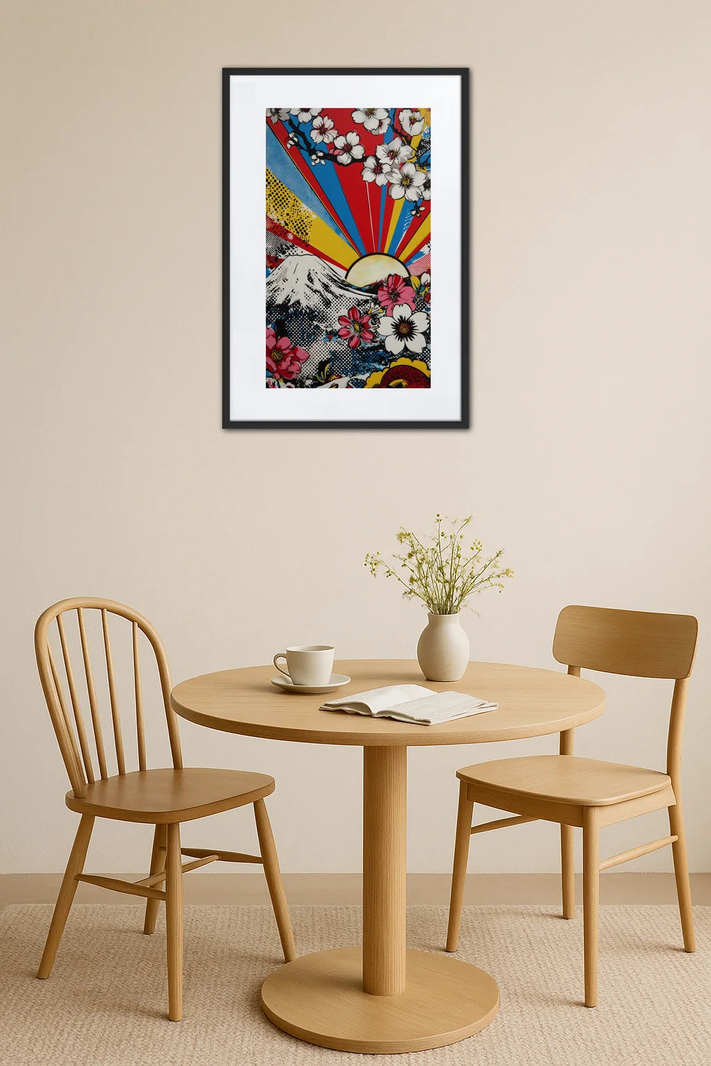 Cette œuvre incarne une célébration joyeuse de la culture japonaise revisitée à travers le prisme du pop art, mêlant harmonieusement le patrimoine à une expression contemporaine pleine de vitalité. Le mont Fuji, figure emblématique et majestueuse, s’élève au centre, baigné par un lever de soleil éclatant dont les rayons multicolores semblent traverser le temps et l’espace. Autour, des fleurs délicates, symbole de la beauté éphémère, dialoguent avec des aplats dynamiques et des textures inspirées de l’imagerie moderne. Ce tableau est une invitation à ressentir la dualité entre la force tranquille de la nature et l’exubérance des formes modernes, à travers un jeu de contrastes qui captivent le regard. Chaque élément, chaque contour, semble vibrer d’une énergie nouvelle, comme une ode à la créativité sans frontières. Il évoque une sensibilité artistique qui transcende les époques, où le passé se mêle au présent dans une harmonie lumineuse. Cette composition singulière réveille en nous des émotions mêlées de nostalgie et d’émerveillement, tout en invitant à une contemplation joyeuse et renouvelée de l’art japonais, magnifié par la liberté du pop art.