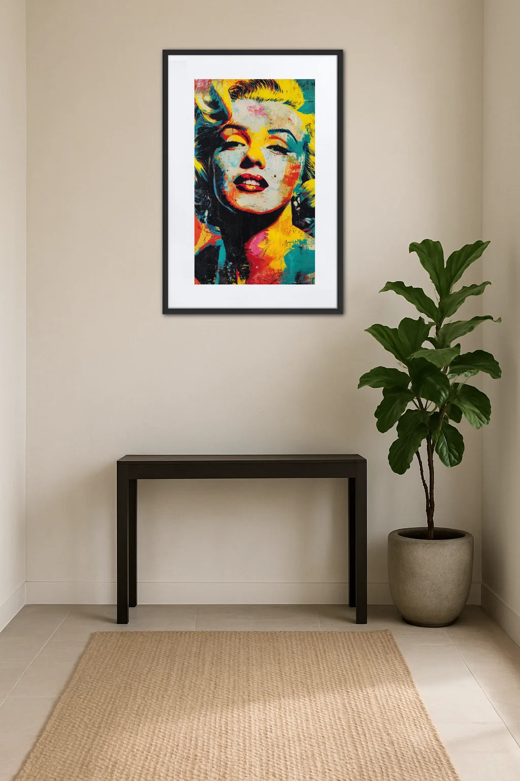 - Une icône réinventée : Le visage emblématique de Marilyn Monroe est revisité avec modernité, évoquant à la fois nostalgie et renouveau. Cette double lecture provoque une connexion intime, mêlant admiration et réflexion personnelle.