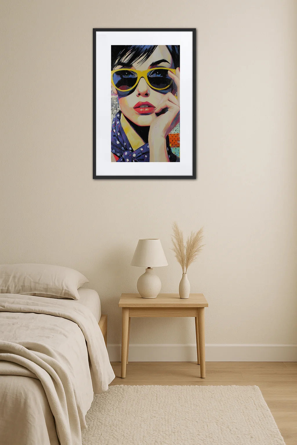 Ce tableau Pop Art Moderne évoque une femme au regard affirmé, portant des lunettes jaunes éclatantes qui deviennent le miroir d’une époque où l’individualité s’exprime avec force et liberté. La composition joue sur le contraste entre la douceur du visage et la vivacité des éléments graphiques, offrant un voyage sensoriel au cœur d'une culture urbaine vibrante. L’art se mêle ici à la vie quotidienne, transformant un simple portrait en un hymne à la confiance en soi et à la singularité. Chaque détail, du foulard aux lèvres rouges, semble célébrer la beauté du détournement iconographique propre au Pop Art, rappelant que l’art est une fenêtre ouverte sur nos émotions et nos aspirations. La manière dont les couleurs s’entrelacent avec des touches de motifs subtils rend cette œuvre aussi élégante qu’intense, une invitation permanente à regarder au-delà des apparences pour ressentir l’âme de la ville et de ses habitants.