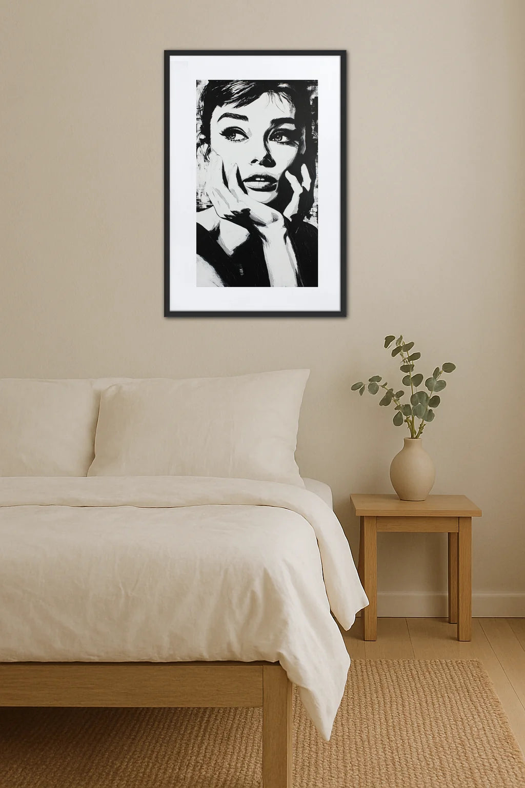 Née d’une maîtrise subtile des contrastes, cette œuvre s’inscrit dans la lignée des grands portraits emblématiques qui ont marqué l’histoire du Pop Art, réinterprétant avec finesse et modernité une figure iconique du cinéma et de la culture populaire. Le noir et blanc accentuent la profondeur des émotions, révélant une personnalité à la fois mystérieuse et pleine de vie, oscillant entre douceur et force intérieure. Chaque coup de pinceau, chaque zone d’ombre et de lumière raconte une histoire, un fragment de rêve et de réalité entremêlés. Cette composition invite à une contemplation intime où les frontières entre art et expression personnelle s’effacent, laissant place à un dialogue silencieux entre l’œuvre et son spectateur. L’attention portée aux détails, aux lignes et aux formes crée une dynamique visuelle qui capte et retient le regard, évoquant tour à tour nostalgie, sophistication et modernité. En s’appuyant sur les codes du Pop Art, ce tableau transcende la simple image pour devenir un véritable manifeste de style et d’émotion, un hommage vibrant à la culture et à l’art sous une forme épurée et saisissante.