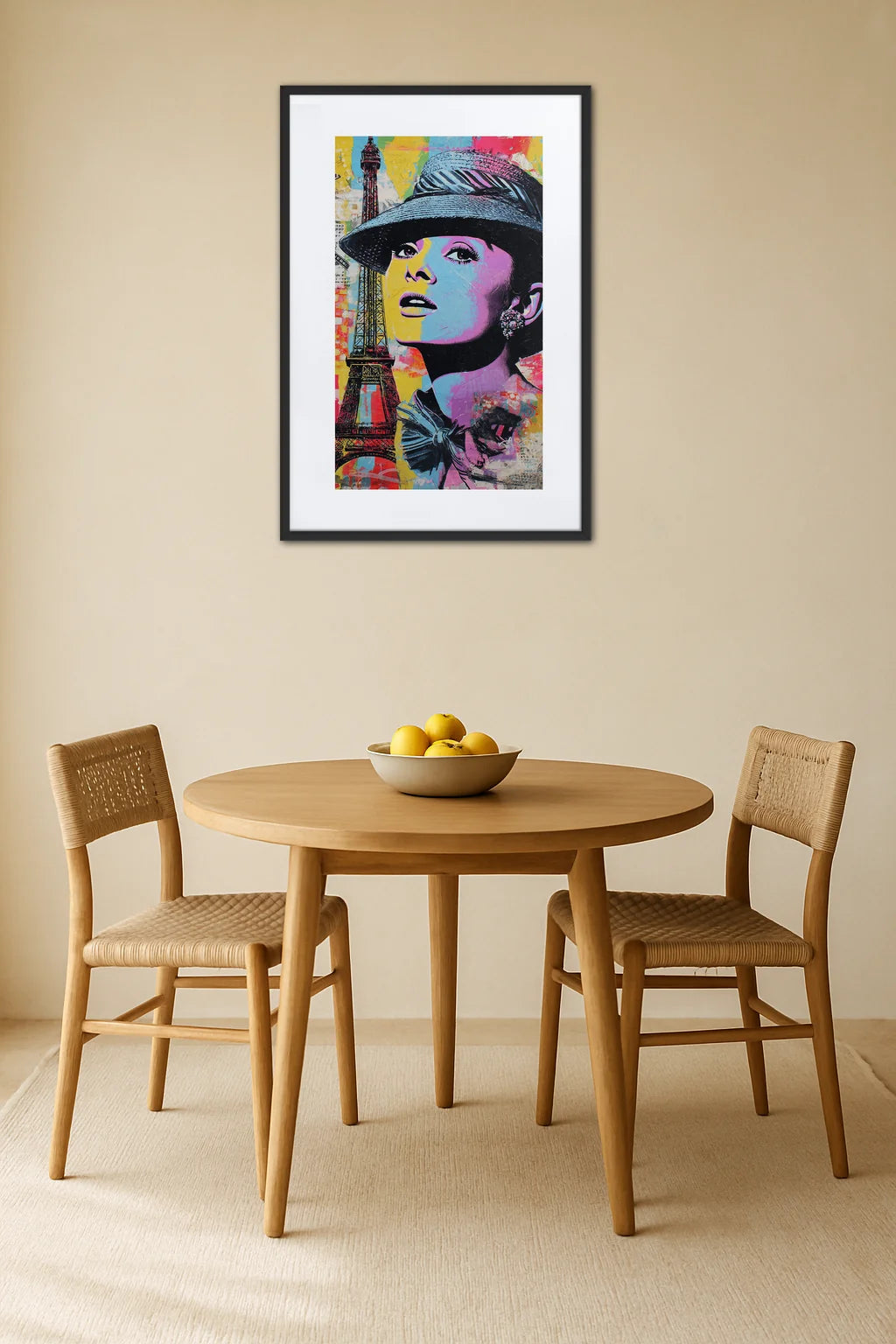 Cette œuvre incarne la rencontre entre la sophistication d’une figure emblématique et la silhouette emblématique de Paris, symbolisée par la Tour Eiffel. Elle raconte une histoire où le classicisme se réinvente avec une énergie moderne, dans un jeu de contrastes qui capte le regard et l’émotion. La palette choisie, vive et affirmée, accentue ce dialogue entre passé et présent, entre la douceur des traits et la force des lignes. C’est un hommage à la capitale française, à son charme unique et à son influence culturelle. Le tableau évoque la séduction d’un Paris rêvé, baigné dans une lumière éclatante qui transcende le temps. À travers cette composition, l’artiste nous invite à ressentir la poésie urbaine, la créativité débordante, ainsi que l’effervescence d’une ville qui ne cesse de se réinventer. Chaque détail, chaque éclat, chaque contour raconte une histoire de passion et d’audace, offrant une fenêtre ouverte sur un univers où l’art devient une célébration de la vie et des émotions intenses.