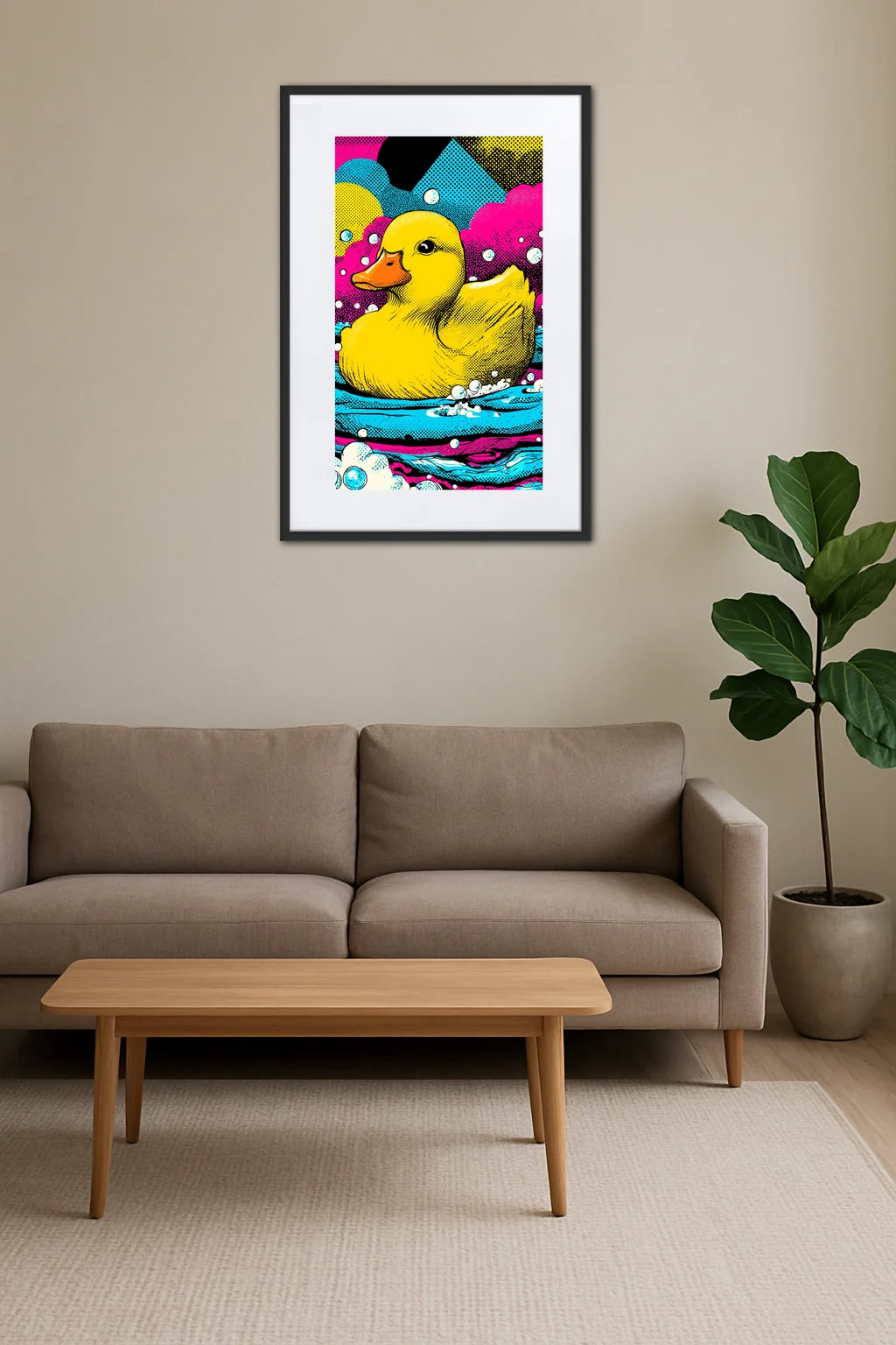 Cette œuvre saisissante s'inspire de la simplicité enfantine d’un objet familier, le canard en plastique, pour en faire une icône d’expression contemporaine. Ici, le quotidien se métamorphose en une scène vibrante où les bulles tourbillonnantes et les formes audacieuses dialoguent avec la figure centrale, symbole d’innocence et de légèreté. La composition joue avec les contrastes, mêlant formes nettes et textures dynamiques, évoquant à la fois le rythme effervescent d’une ville moderne et la douceur d’un instant suspendu. Elle convoque une émotion universelle, celle d’un retour à la simplicité joyeuse, tout en célébrant la richesse des univers visuels issus de la culture populaire. Plus qu’une image, ce tableau est une invitation à l’évasion intérieure, un éclat de couleur qui éclaire et anime l’espace, insufflant un souffle d’optimisme et de fraîcheur. Son esthétique décalée et son énergie communicative résonnent comme un clin d’œil à l’audace créative du mouvement Pop Art, tout en s’inscrivant avec élégance dans une décoration contemporaine. Il incarne le plaisir de redécouvrir la beauté dans l’ordinaire, et la capacité de l’art à transformer le banal en extraordinaire.