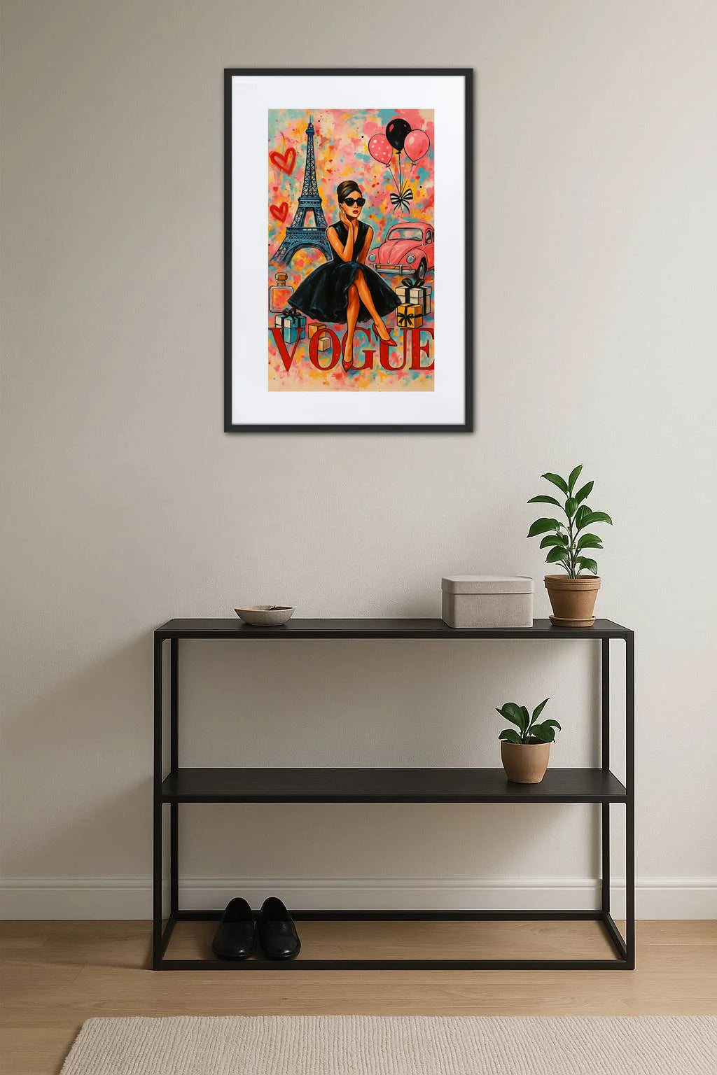 Ce tableau Pop Art Vogue est une ode à la féminité sophistiquée et à l’énergie exaltante de Paris. Sur un arrière-plan éclatant, les touches dynamiques de couleur évoquent le tumulte joyeux des rues parisiennes, là où chaque instant est une promesse d’émerveillement. La silhouette de la femme, vêtue d’une robe noire emblématique, rappelle les icônes du cinéma et de la mode, figures intemporelles qui continuent d’inspirer par leur grâce et leur audace. Autour d’elle, des symboles familiers s’entremêlent avec légèreté et poésie : la Tour Eiffel, témoin majestueux des rêves et des ambitions, une voiture rétro pleine de charme, des ballons flottant dans l’air, comme autant de souvenirs d’enfance et de légèreté. Le mot « Vogue » inscrit en lettres affirmées, souligne ce lien profond entre art, culture et style, fusionnant le passé et le présent dans un éclat vibrant. Cette composition invite à ressentir la passion d’un mode de vie où chaque détail compte, où les émotions se mêlent aux images pour créer une atmosphère unique et captivante. Plus qu’une simple illustration, ce tableau est une fenêtre ouverte sur un univers où la beauté se fait manifeste, intemporelle et pleine de vie.