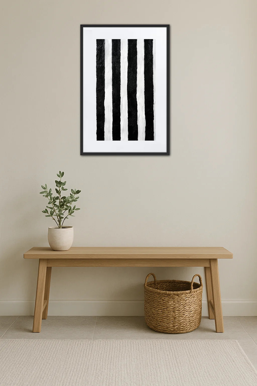 - Contraste saisissant : Les bandes noires et blanches captent immédiatement l’attention, créant un jeu de lumière qui dynamise la pièce. Ce contraste visuel stimule l’esprit et invite à la contemplation, éveillant une émotion raffinée et profonde.