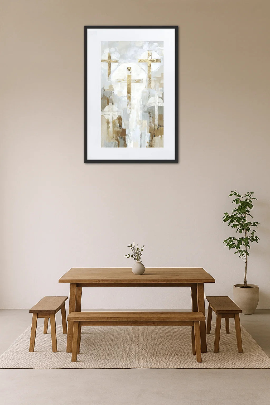 - Équilibre apaisant : Les croix délicatement posées sur un fond nuancé créent une harmonie visuelle qui apaise l’esprit. Cette sérénité se diffuse dans la pièce, invitant à la méditation et à la réflexion intérieure. Le regard se perd dans cette douce clarté, suscitant un sentiment profond de paix.
