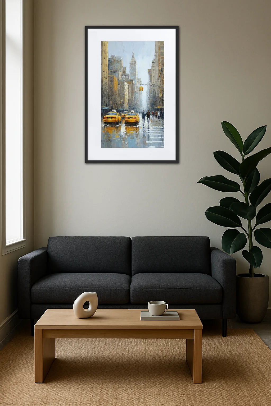 Ce tableau Rue De New York invite à plonger dans l’âme bouillonnante de la métropole américaine, où le rythme effervescent se mêle à une certaine douceur picturale. L’artiste a su saisir la magie d’un après-midi pluvieux, où les reflets sur le bitume racontent mille histoires. Les taxis jaunes, emblèmes incontestables de la ville, avancent comme des phares dans la grisaille, accompagnés par des passants qui semblent perdus dans leurs pensées. Plus qu’une simple représentation, cette œuvre évoque les contrastes qui façonnent New York : la rencontre entre le tumulte et la poésie, l’architecture massive et la fragilité humaine, la modernité éclatante et la mémoire des rues. Le choix des formes et des touches révèle une intention de rendre hommage à cette mosaïque urbaine, où chaque détail raconte une aventure, un espoir ou une rencontre. Cette scène invite à ressentir la vie palpitante d’une ville qui ne dort jamais, à la fois familière et mystérieuse, où chaque coin de rue recèle un nouveau récit à découvrir.