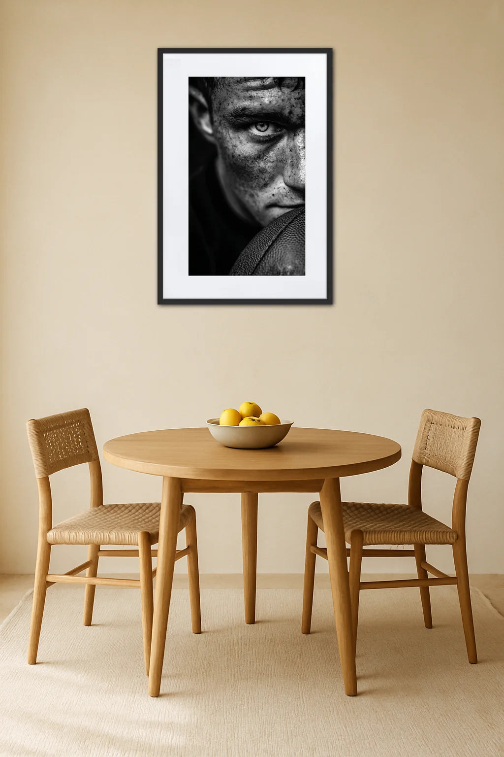 Ce tableau évoque un univers où la puissance physique se mêle à une profondeur émotionnelle rarement capturée. Le visage marqué par la sueur et la poussière, l’œil perçant, concentré, révèle la dualité du sportif : la lutte intérieure et l’engagement absolu. Le choix du noir et blanc transcende la simple image pour plonger dans un univers intemporel et épuré, où les contrastes soulignent chaque trait, chaque ride, chaque éclat d’émotion. Cette œuvre ne se contente pas de représenter un joueur de rugby, elle incarne la quête, la résilience, le moment avant l’effort, où tout bascule. Elle parle à ceux qui savent que le sport est un théâtre d’humanité, un langage universel fait de défis et de dépassement. L’iconographie détournée du ballon et du visage crée une composition où la tension visuelle se fait presque palpable, invitant à une contemplation prolongée. Chaque regard posé sur cette œuvre révèle une nouvelle facette, une nouvelle histoire, une énergie qui ne se dément jamais.