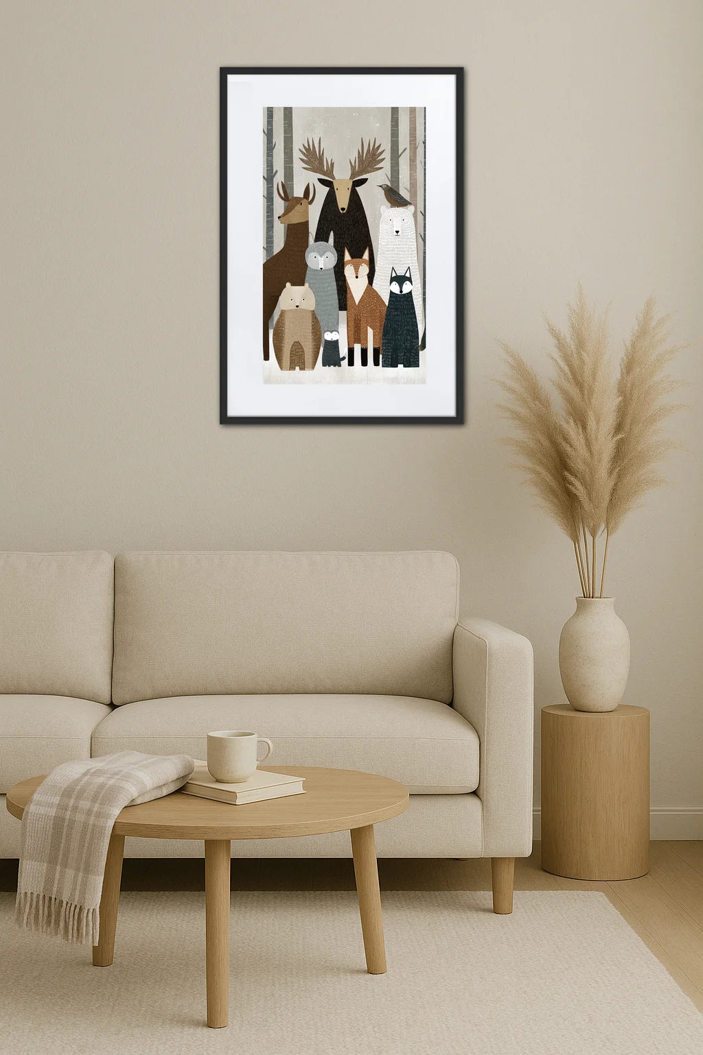 Cette œuvre puise son inspiration dans les vastes forêts du Nord, où la nature se fait à la fois mystérieuse et accueillante. Les animaux, représentés avec une touche de naïveté et d’élégance, incarnent l’équilibre fragile entre force et douceur que l’on retrouve dans les paysages scandinaves. Leur présence collective évoque une communauté soudée, un monde où chaque être trouve sa place dans un silence rempli de vie. Le choix des formes simples et des contours nets rappelle les traditions artisanales du design nordique, où chaque détail est pensé pour évoquer un sentiment d’apaisement et de connexion profonde à la terre. Les teintes naturelles et l’ambiance épurée transportent le regard vers un univers où le temps semble suspendu, invitant à la contemplation et à la rêverie. Plus qu’un simple décor, ce tableau incarne une philosophie, un regard posé sur la nature avec respect et admiration, révélant la beauté subtile de la faune sauvage. Il s’adresse à ceux qui cherchent dans l’art une résonance intime, un refuge où la délicatesse du trait dialogue avec la force tranquille des animaux.
