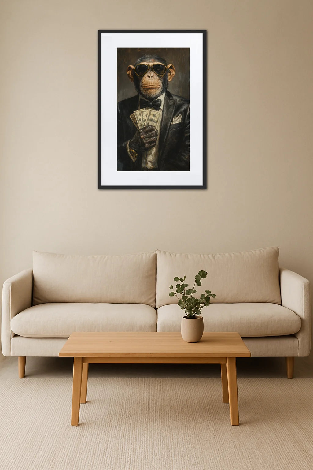Ce tableau, portrait d’un chimpanzé vêtu d’un costume sombre et d’une paire de lunettes aux reflets dorés, nous transporte dans une ambiance où le monde animalier rencontre la haute société. L’œuvre invite à réfléchir sur les contrastes et les paradoxes qui animent notre propre nature : la sauvagerie brute et l’élégance maîtrisée. L’animal, souvent symbole d’instinct et de liberté, se pare ici d’éléments humains, suggérant une forme de complicité entre ces deux mondes. Le choix d’une palette sobre mais intense amplifie cette rencontre, soulignant la profondeur du regard et la texture des matières. Plus qu’une simple représentation, ce tableau évoque une narration silencieuse où chaque détail raconte une histoire, celle d’une personnalité affirmée, d’une confiance en soi inébranlable. C’est un hommage à ces moments où l’on ose se montrer sous un jour inédit, à la fois puissant et élégant. Ce chimpanzé, avec sa main tenant fermement des billets, incarne une sorte de mystère et de charme qui ne laisse pas indifférent, mêlant humour et réflexion sur le statut, la richesse et l’identité. Une œuvre qui stimule l’imagination tout en embellissant l’espace qu’elle habite.