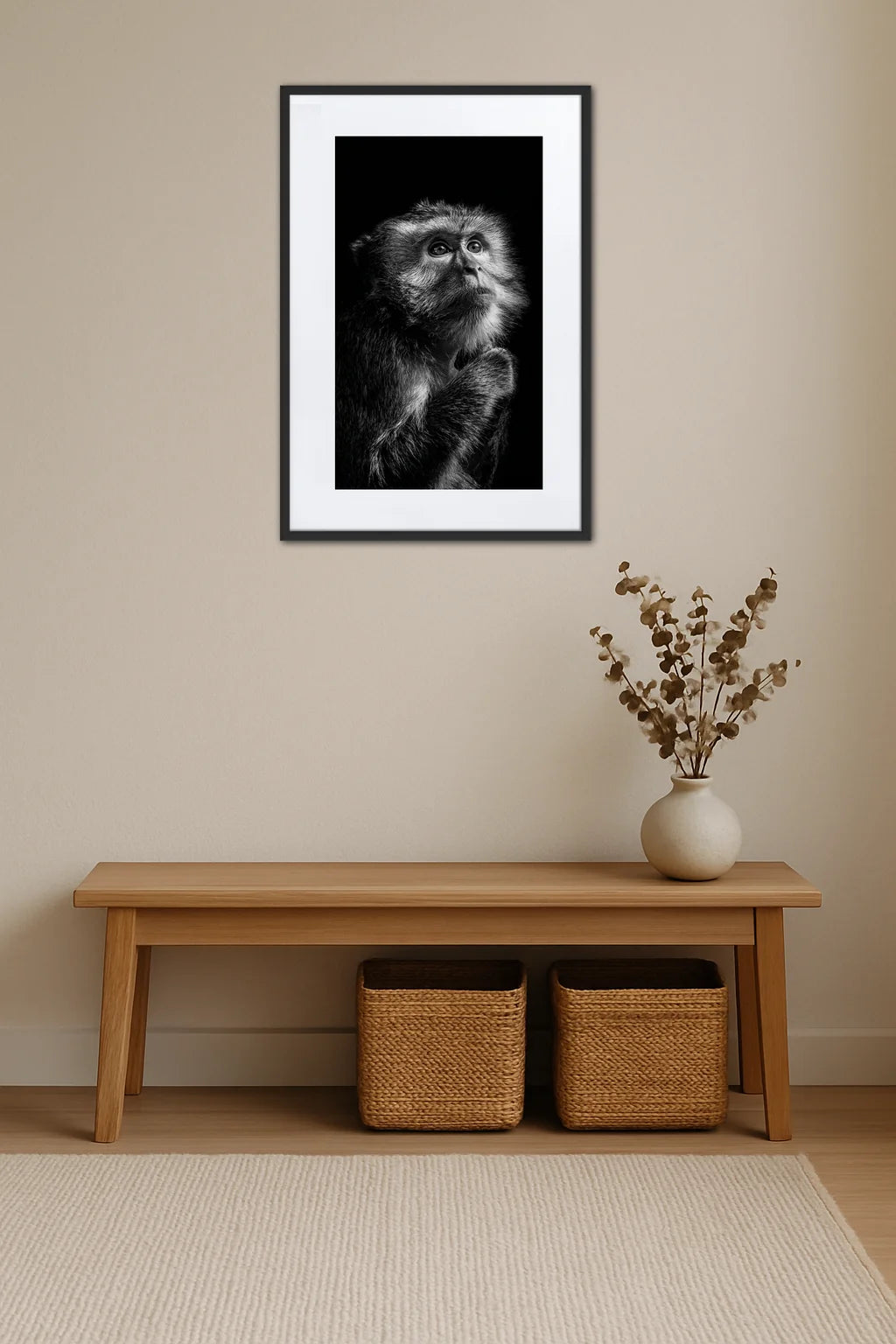 Ce Tableau Singe Noir Et Blanc incarne un dialogue muet entre la nature brute et l’âme humaine. La monochromie accentue la profondeur du regard de ce primate, révélant une sagesse presque universelle et intemporelle. Chaque détail du pelage, chaque nuance de lumière sur son visage, raconte une histoire d’observation et d’émerveillement. Ce singe, figé dans une posture à la fois vulnérable et pleine de dignité, semble incarner la quête d’une vérité intérieure, celle que l’on cherche au-delà des apparences. Son expression évoque une forme d’introspection profonde, comme si l’animal partageait une pensée secrète, un fragment d’émotion que seul le spectateur attentif peut percevoir. Ce tableau ne se limite pas à un simple portrait animalier, il devient un miroir de notre propre humanité, un pont entre le sauvage et le sensible. En le contemplant, on ressent cette tension délicate entre la lumière et l’ombre, la force et la fragilité, qui anime toute création artistique digne de ce nom. Enraciné dans un univers esthétique où le contraste joue un rôle primordial, il invite à une expérience visuelle et émotionnelle raffinée, propre aux plus belles œuvres contemporaines.