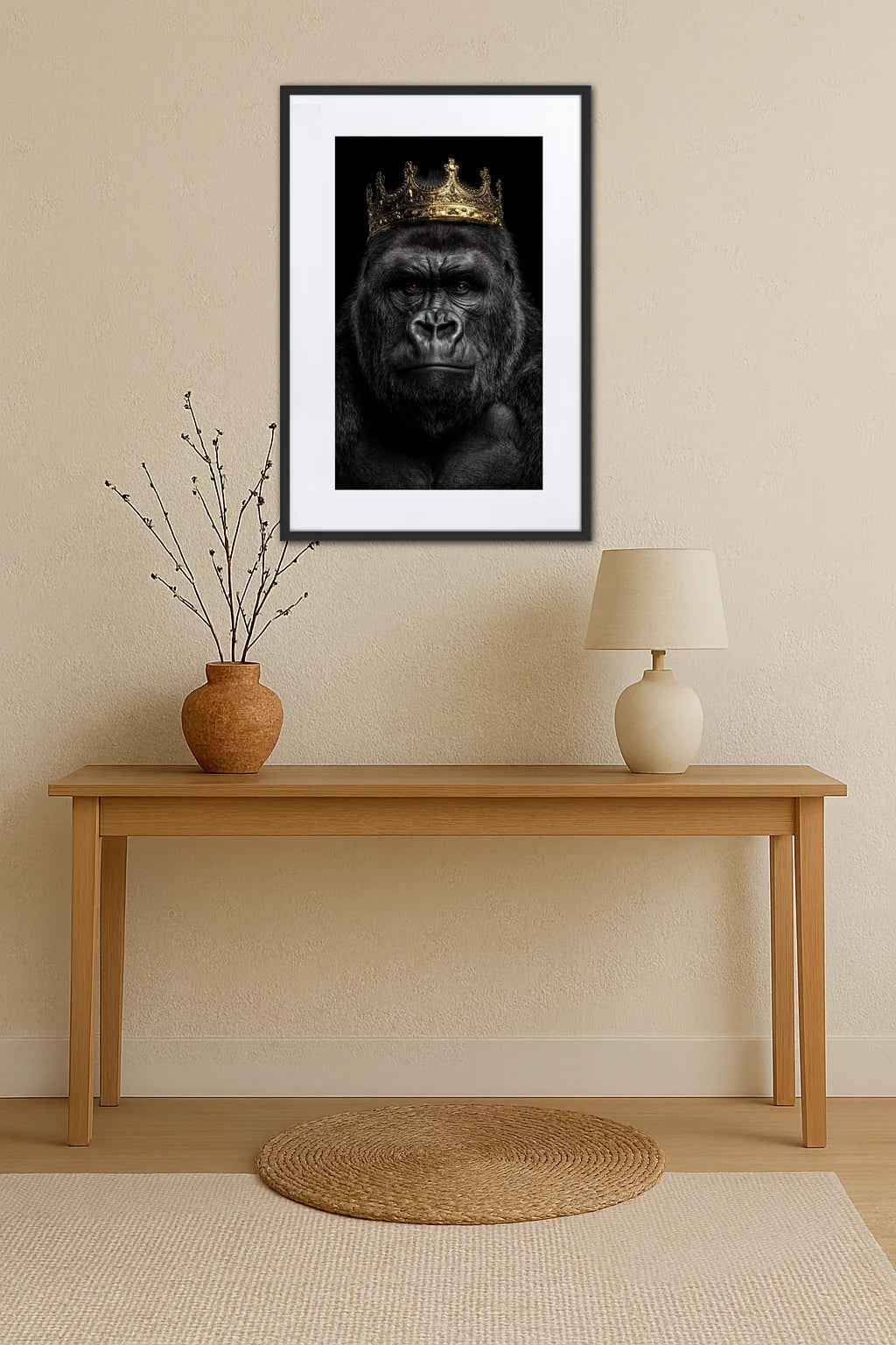 Ce tableau évoque un dialogue entre la nature brute et l'iconographie de la royauté, où le singe, souvent perçu comme simple animal, se dresse en souverain. Sa couronne, richement détaillée, contraste avec la profondeur de son pelage sombre, signalant une puissance silencieuse et une autorité qui ne s'impose pas mais s'impose naturellement. L’œuvre puise dans une tradition artistique qui détourne les symboles, offrant une nouvelle lecture où le règne n’est plus réservé à l’homme, mais partagé avec l’essence même de la vie sauvage. Ce roi au regard fixe semble nous inviter à réfléchir sur la grandeur naturelle, la force intérieure et la dignité souvent méconnue de l’animal. Le fond noir accentue la présence du sujet, intensifiant la scène et faisant vibrer les détails dorés de la couronne comme autant de signes d’un pouvoir ancestral, presque mystique. Cette composition incarne à la fois la séduction et la profondeur d’un univers où la sauvagerie se pare d’élégance, où la puissance se fait poésie. Ainsi, chaque regard posé sur ce tableau devient une invitation à pénétrer un royaume où s’entremêlent culture, nature et symbolisme profond.