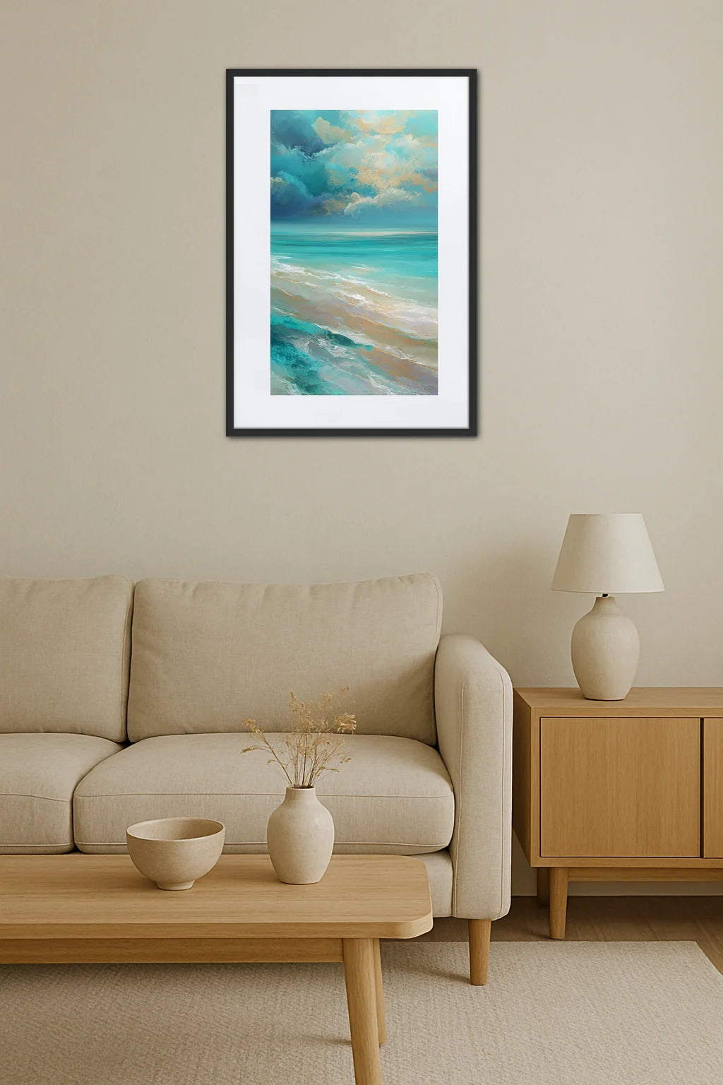 - Une atmosphère intemporelle : L’équilibre entre ciel et mer suggère une profondeur méditative, un espace hors du temps. Cette ambiance enveloppante invite à la contemplation et offre une sensation de sérénité durable.