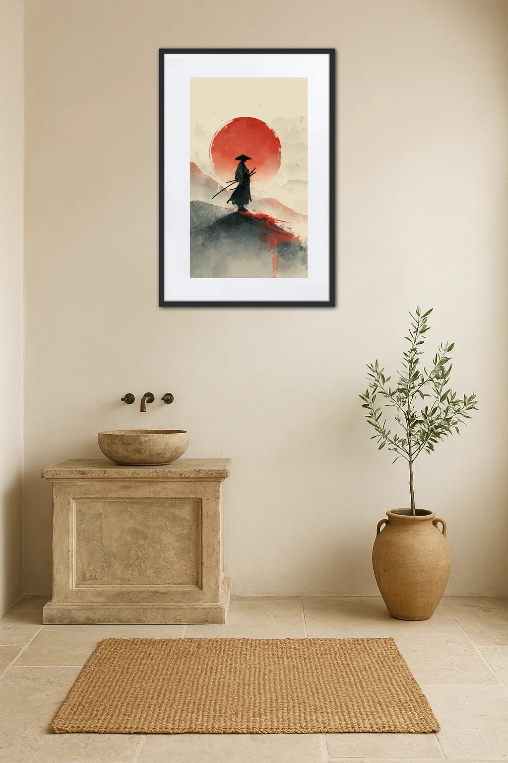 Ce tableau saisit l’essence même de la culture japonaise en mêlant la simplicité des formes à la profondeur symbolique. La figure du samouraï, au sommet d’une colline embrumée, incarne la détermination silencieuse et l’honneur intemporel. Le halo solaire, d’un rouge intense, évoque à la fois la puissance du jour naissant et la passion qui anime chaque guerrier. En arrière-plan, les montagnes se fondent dans une brume légère, rappelant la nature changeante et la quête d’équilibre entre l’homme et son environnement. Cette composition joue sur les contrastes et la subtilité des nuances pour offrir un équilibre délicat entre force et sérénité. Elle résonne comme un poème visuel, où chaque détail invite à une méditation profonde sur le courage, la solitude choisie et le lien sacré entre passé et présent. Plus qu’une simple image, ce tableau est une fenêtre ouverte sur un univers où traditions ancestrales et émotions contemporaines s’entrelacent avec grâce et élégance, capturant l’âme d’un Japon à la fois mystérieux et vibramment vivant.