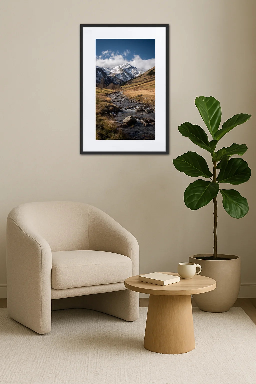 Ce tableau évoque la puissance tranquille des montagnes qui veillent sur le monde, leur silhouette enneigée se détachant sur un ciel d'un bleu profond, presque infini. La vallée au premier plan, où serpente un ruisseau clair, invite à une promenade silencieuse, un dialogue intime avec la nature dans sa forme la plus pure. Cette œuvre transcende la simple représentation paysagère pour devenir un hommage à la quête d'équilibre entre l'homme et son environnement. On y ressent l'appel des grands espaces, cette promesse de liberté où chaque élément semble en parfaite symbiose. L'herbe dorée caressée par la lumière d'automne contraster avec la blancheur immaculée des pics, offre un jeu de nuances qui stimule la contemplation. Plus qu'une image, ce tableau est une invitation à ralentir, à retrouver en soi la sérénité d'un lieu où le temps suspend son vol. Il capture l'éternelle beauté des montagnes, leur mystère et leur force, révélant ainsi une poésie visuelle qui résonne avec l'âme de ceux qui le contemplent.
