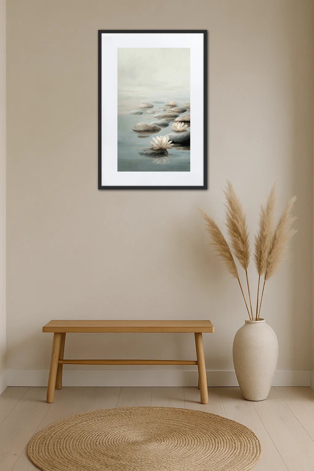 Ce tableau évoque un chemin de pierres sur une eau paisible, sublimé par la délicatesse de nénuphars blancs qui semblent flotter en parfaite légèreté. Cette œuvre est une invitation à la méditation, à ce moment où le tumulte du quotidien laisse place à une respiration profonde et un calme retrouvé. Les formes arrondies des pierres, doucement posées comme autant de pas vers un ailleurs intérieur, dialoguent avec la pureté des fleurs qui symbolisent la renaissance et la lumière dans la pénombre. Le choix des teintes subtiles et des reflets délicats crée une atmosphère aérienne, presque éthérée, où le temps semble s’arrêter. Inspirée des philosophies orientales, cette composition invite à retrouver l’équilibre entre mouvement et immobilité, entre matière et esprit. Le spectateur est ainsi convié à un voyage sensoriel qui transcende la simple image pour devenir une expérience intime, un souffle d’apaisement qui s’installe durablement. Plus qu’un décor, ce tableau devient un compagnon silencieux qui éclaire le chemin vers la sérénité, un rappel délicat que la beauté réside souvent dans la simplicité et l’harmonie retrouvée.