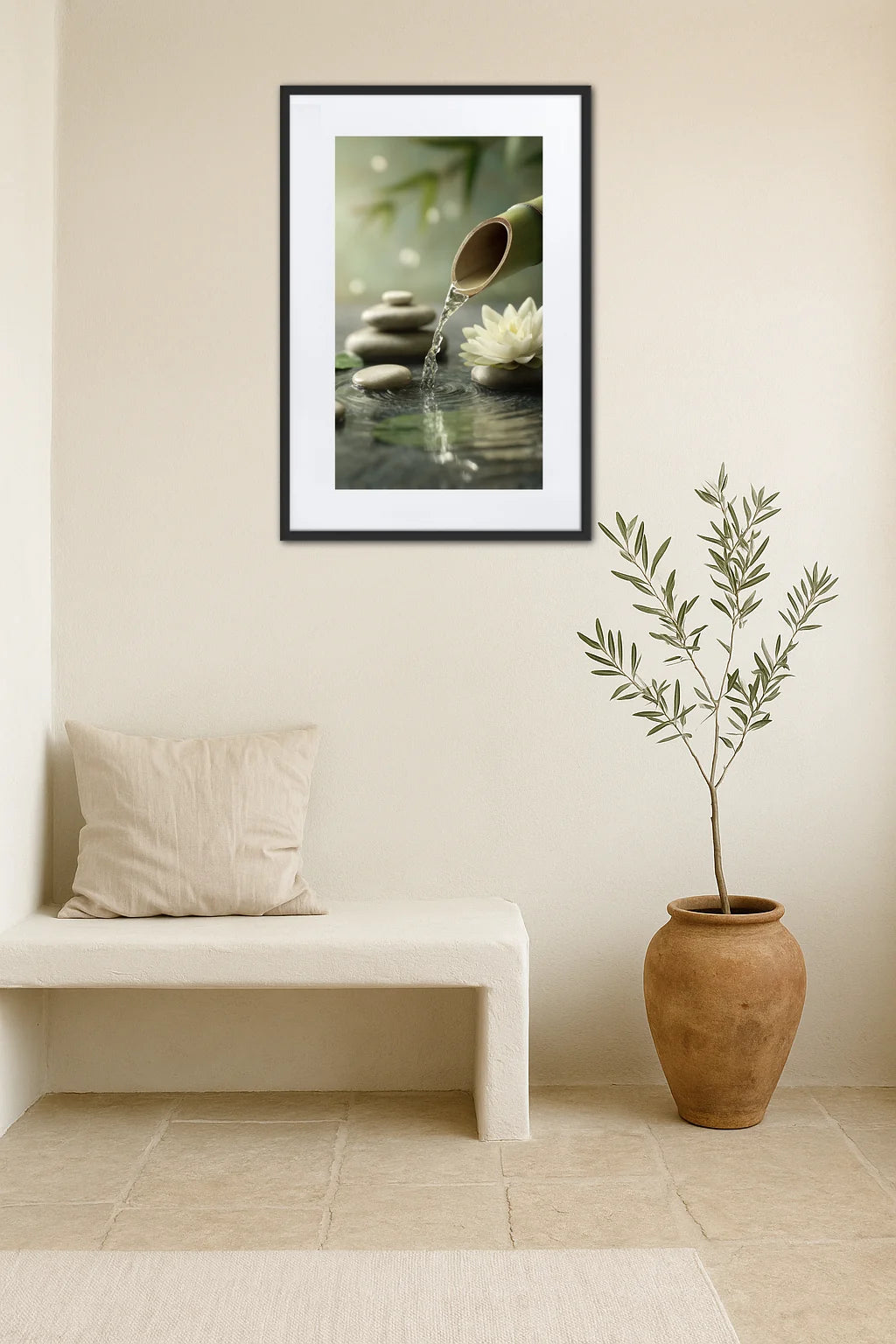 Ce tableau incarne un moment précieux où la nature se fait confidente de nos aspirations les plus profondes. L’eau qui s’écoule lentement du bambou évoque la fluidité du temps, comme un souffle qui apaise et renouvelle. Autour, les pierres lisses, empilées avec délicatesse, rappellent la quête d’un équilibre fragile, celui qui soutient la paix intérieure malgré les tourments du quotidien. La fleur de lotus, symbole de pureté et de renaissance, éclaire la composition d’une lumière douce et bienveillante, invitant le regard à se poser et à se laisser bercer. Cette œuvre puise dans les traditions orientales, mêlant l’iconographie zen à une interprétation contemporaine où chaque détail devient un appel à la méditation. L’ambiance feutrée, presque tactile, convoque une atmosphère où le temps suspend son cours, où l’âme trouve refuge et inspiration dans la simplicité subtile des formes et des matières. Plus qu’un décor, ce tableau est une respiration, un dialogue silencieux mais vibrant entre la nature et l’esprit, une promesse de calme retrouvée dans l’écho intemporel du mouvement de l’eau.