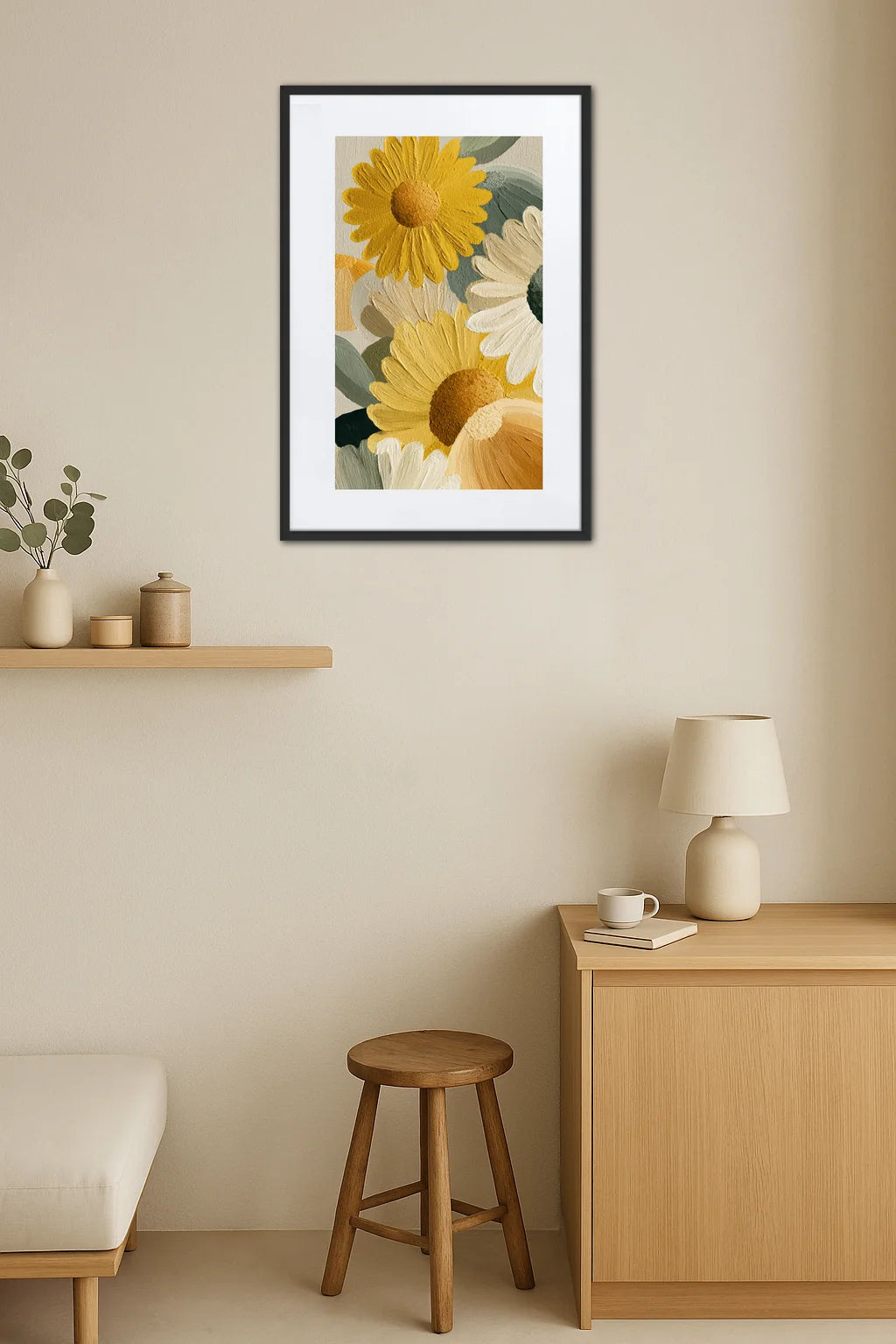 Ce tableau Tournesol Moderne s’impose comme un hymne à la vitalité et à la simplicité retrouvée. Il évoque la lumière d’une fin d’après-midi, ce moment suspendu où les derniers rayons caressent les fleurs avec une tendresse infinie. L’artiste joue avec les formes et les volumes pour réinventer l’iconographie classique du tournesol, symbole intemporel de chaleur et de bonheur. Ce choix floral, pourtant traditionnel, est revisité avec une audace douce, mêlant des teintes riches et nuancées qui donnent vie à une composition à la fois contemporaine et intemporelle. La texture visible crée une sensation tactile, comme si l’on pouvait presque toucher la surface veloutée des pétales. Plus qu’une représentation, c’est une invitation à ressentir l’énergie solaire qui anime cette fleur, à la fois familière et magnifiée. À travers cette œuvre, la nature devient un langage qui transcende les époques, reliant l’observateur à un univers où chaque élément participe à un dialogue vibrant entre lumière et forme. Un véritable voyage sensoriel se déploie, porté par une esthétique raffinée et une poésie visuelle qui réchauffe l’âme.