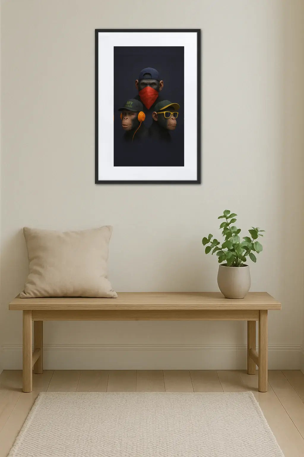 Le Tableau Trois Singes revisite un motif ancestral, celui des trois singes sages, dans une interprétation où chaque détail respire le contemporain. Ici, les singes ne se contentent pas de cacher leurs yeux, leurs oreilles ou leur bouche, ils incarnent une posture complexe, presque rebelle, dans un jeu de contrastes saisissants. La présence du masque rouge vif, les accessoires modernes comme les lunettes ou les casquettes, évoquent une époque où le silence, la cécité volontaire ou l’écoute sélective prennent un nouveau sens, chargé de questionnements sur notre société actuelle. L’intensité des expressions faciales, mêlée à la sobriété de l’arrière-plan, invite à une réflexion intime sur ce que nous choisissons de voir, d’entendre ou de dire. Ce tableau est un pont entre un héritage culturel riche et la vitalité d’une époque en perpétuel changement. Il fait vibrer une tension entre tradition et modernité, entre sagesse ancienne et attitudes contemporaines, offrant au spectateur une expérience visuelle et émotionnelle profonde, où chaque regard ouvre une nouvelle interprétation.