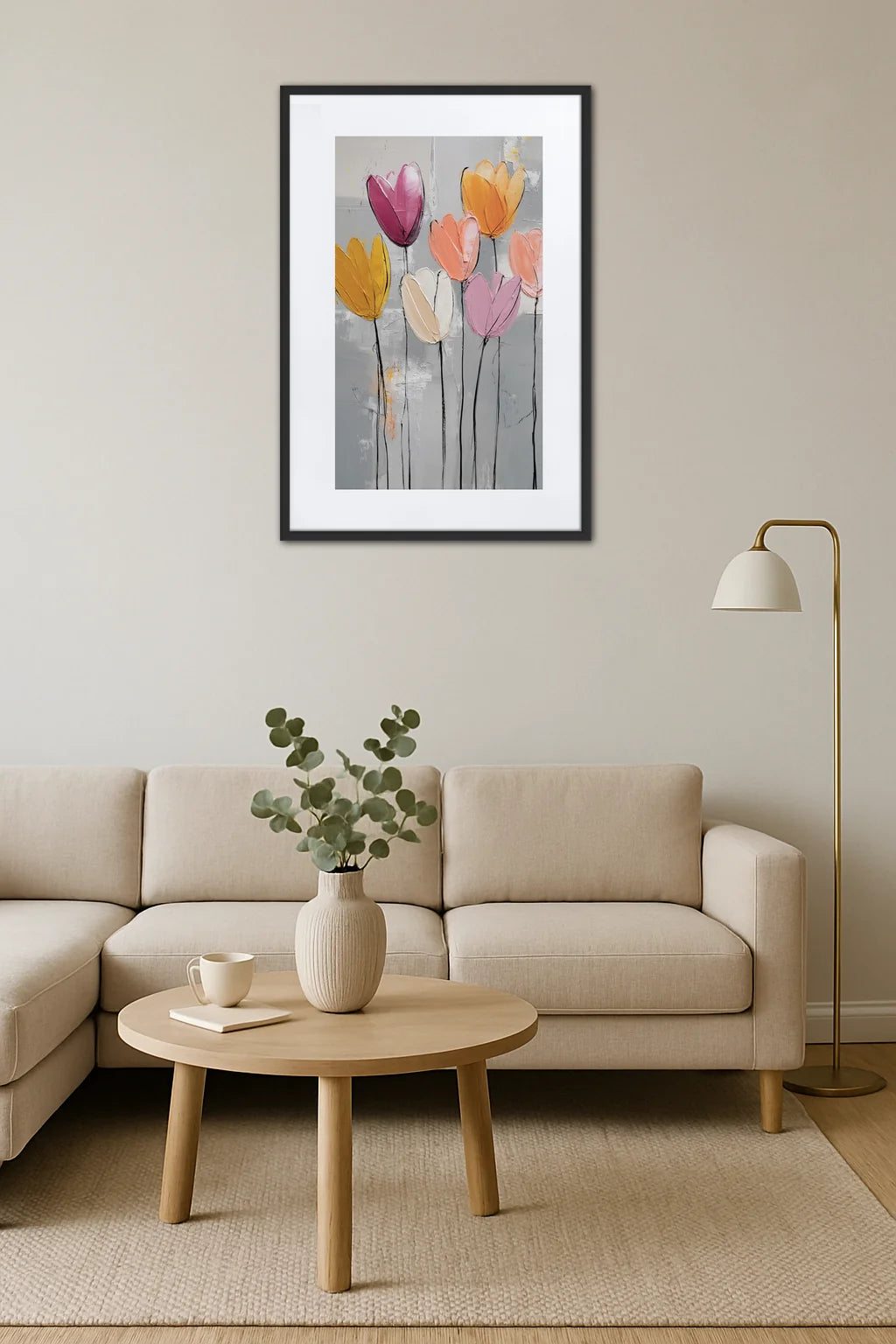 Ce tableau tulipes abstrait puise son inspiration dans la simplicité élégante de la nature revisitée par une approche moderne et sensible. A travers ses formes épurées et ses contours légèrement esquissés, il évoque la fragilité et la force qui cohabitent au sein même des éléments les plus organiques. Les tulipes, symboles universels de renouveau et d’espoir, s’élèvent en une composition où chaque couleur semble raconter une humeur différente, oscillant entre la chaleur douce et la fraîcheur apaisante. Cette œuvre invite à contempler la fusion entre la réalité et l’imaginaire, mêlant la force du trait à la légèreté des teintes. Le fond, volontairement neutre, laisse toute la place à la vitalité des fleurs, comme un écrin réservé à la beauté éphémère et pourtant éternelle. Par sa présence, le tableau devient un espace où le regard vagabonde, où l’âme trouve un refuge esthétique et émotionnel. Il s’inscrit dans une tradition artistique qui célèbre la nature sous un prisme abstrait, tout en insufflant une modernité vibrante, un dialogue sensible entre l’art et celui qui l’observe.