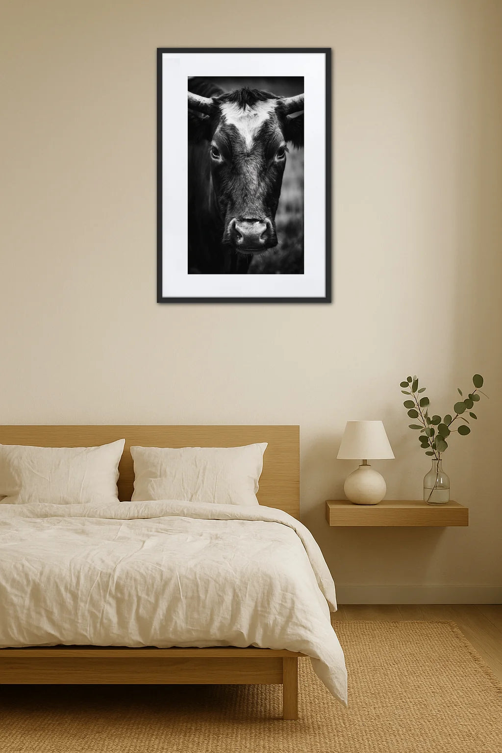 Capturer l'essence d'un animal dans un tableau, c'est offrir une fenêtre sur un monde où le temps semble suspendu. Cette vache, figée dans un jeu d'ombres et de lumières, incarne une dualité saisissante, entre force tranquille et douceur infinie. Son expression, à la fois familière et mystérieuse, invite à un voyage intérieur où la simplicité de la campagne se mêle à la complexité des émotions humaines. Au-delà de l’image, ce portrait noir et blanc évoque aussi une tradition picturale où les contrastes marquent la profondeur du sujet, rappelant les œuvres des grands maîtres qui savaient magnifier la réalité par la sobriété des teintes. Le choix du noir et blanc n’est pas anodin, il souligne la texture, les formes, et surtout la personnalité unique de ce regard animal, qui semble raconter mille histoires sans ouvrir la bouche. Cette pièce s’inscrit dans un dialogue entre modernité et authenticité, où la nature brute rencontre une esthétique épurée, offrant ainsi une expérience visuelle et émotionnelle intense. Elle devient un hommage à la beauté intemporelle, une invitation à ressentir la présence vivante au-delà de l’image, à célébrer la poésie cachée dans la simplicité apparente d’un instant figé.
